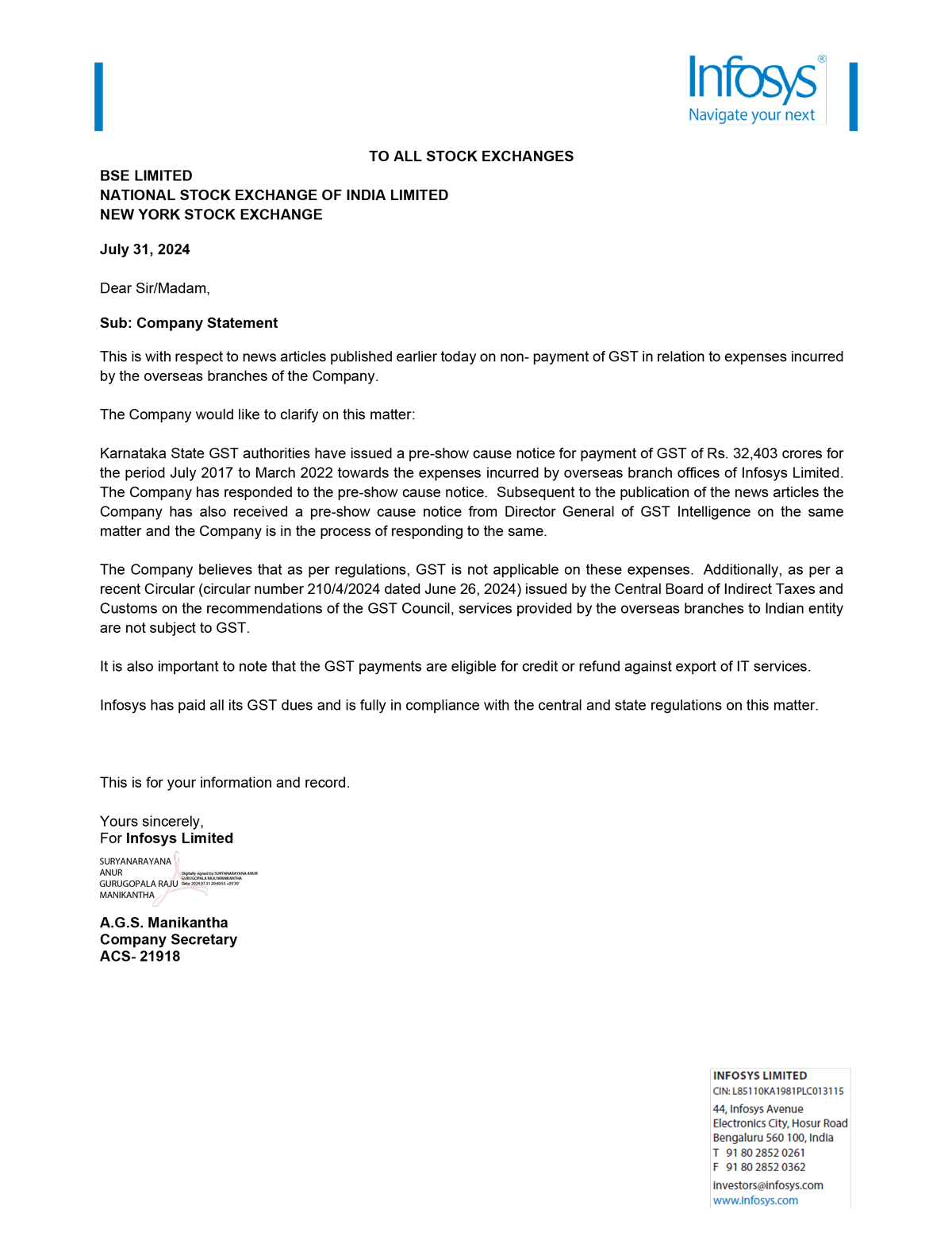 Infosys Limited, a company organized under the laws of the Republic of India ("Infosys", or the "Company"), hereby furnishes with the United States Securities and Exchange Commission this Report on Form 6-K regarding the intimation dated July 31, 2024 pertaining to news articles published on July 31, 2024 on non- payment of GST in relation to expenses incurred by the overseas branches of the Company.