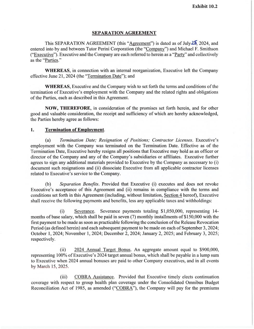 In connection with the Quarterly Report of Tutor Perini Corporation (the “Company”) on Form 10-Q for the period ended June 30, 2024 as filed with the Securities and Exchange Commission on the date hereof (the “Report”), I, Ronald N. Tutor, Chairman and Chief Executive Officer of the Company, certify, pursuant to 18 U.S.C. Section 1350, as adopted pursuant to Section 906 of the Sarbanes-Oxley Act of 2002, that: