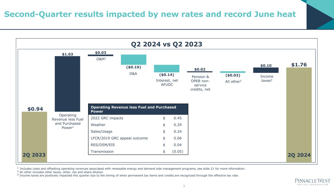 2 This presentation contains forward-looking statements based on current expectations, including statements regarding our earnings guidance and financial outlook and goals. These forward-looking statements are often identified by words such as “estimate,” “predict,” “may,” “believe,” “plan,” “expect,” “require,” “intend,” “assume,” “project,” "anticipate," "goal," "seek," "strategy," "likely," "should," "will," "could," and similar words. Because actual results may differ materially from expectations, we caution you not to place undue reliance on these statements. A number of factors could cause future results to differ materially from historical results, or from outcomes currently expected or sought by Pinnacle West or APS. These factors include, but are not limited to: uncertainties associated with the current and future economic environment, including economic growth rates, labor market conditions, inflation, supply chain delays, increased expenses, volatile capital markets, or other unpredictable effects; our ability to manage capital expenditures and operations and maintenance costs while maintaining reliability and customer service levels; variations in demand for electricity, including those due to weather, seasonality (including large increases in ambient temperatures), the general economy or social conditions, customer, and sales growth (or decline), the effects of energy conservation measures and distributed generation, and technological advancements; the potential effects of climate change on our electric system, including as a result of weather extremes such as prolonged drought and high temperature variations in the area where APS conducts its business; power plant and transmission system performance and outages; competition in retail and wholesale power markets; regulatory and judicial decisions, developments, and proceedings; new legislation, ballot initiatives and regulation or interpretations of existing legislation or regulations, including those relating to environmental requirements, regulatory and energy policy, nuclear plant operations and potential deregulation of retail electric markets; fuel and water supply availability; our ability to achieve timely and adequate rate recovery of our costs through our rates and adjustor recovery mechanisms, including returns on and of debt and equity capital investment; the ability of APS to meet renewable energy and energy efficiency mandates and recover related costs; the ability of APS to achieve its clean energy goals (including a goal by 2050 of 100% clean, carbon-free electricity) and, if these goals are achieved, the impact of such achievement on APS, its customers, and its business, financial condition, and results of operations; risks inherent in the operation of nuclear facilities, including spent fuel disposal uncertainty; current and future economic conditions in Arizona; the direct or indirect effect on our facilities or business from cybersecurity threats or intrusions, data security breaches, terrorist attack, physical attack, severe storms, or other catastrophic events, such as fires, explosions, pandemic health events or similar occurrences; the development of new technologies which may affect electric sales or delivery, including as a result of delays in the development and application of new technologies; the cost of debt, including increased cost as a result of rising interest rates, and equity capital and our ability to access capital markets when required; environmental, economic, and other concerns surrounding coal-fired generation, including regulation of greenhouse gas emissions; volatile fuel and purchased power costs; the investment performance of the assets of our nuclear decommissioning trust, pension, and other postretirement benefit plans and the resulting impact on future funding requirements; the liquidity of wholesale power markets and the use of derivative contracts in our business; potential shortfalls in insurance coverage; new accounting requirements or new interpretations of existing requirements; generation, transmission and distribution facilities and system conditions and operating costs; our ability to meet the anticipated future need for additional generation and associated transmission facilities in our region; the willingness or ability of our counterparties, power plant participants and power plant landowners to meet contractual or other obligations or extend the rights for continued power plant operations; and restrictions on dividends or other provisions in our credit agreements and ACC orders. These and other factors are discussed in the most recent Pinnacle West/APS Form 10-K along with other public filings with the Securities and Exchange Commission, which you should review carefully before placing any reliance on our financial statements, disclosures or earnings outlook. Neither Pinnacle West nor APS assumes any obligation to update these statements, even if our internal estimates change, except as required by law. In this presentation, references to net income and earnings per share (EPS) refer to amounts attributable to common shareholders. Forward Looking Statements