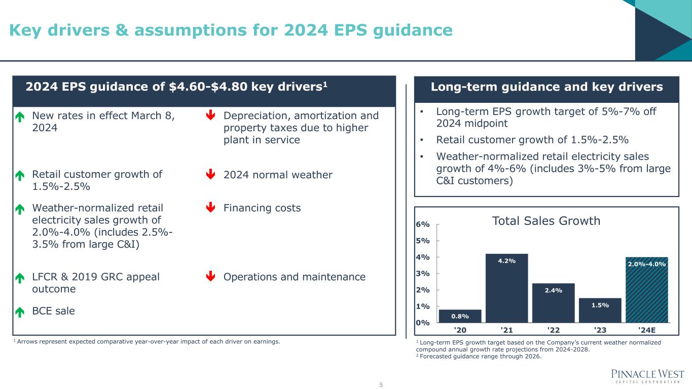 Key Factors and Assumptions (as of August 1, 2024) 2024 Adjusted gross margin (operating revenues, net of fuel and purchased power expenses, x/RES,DSM,CCT)1 $2.93 – $3.00 billion • Retail customer growth of 1.5%-2.5% • Weather-normalized retail electricity sales growth of 2.0%-4.0% • Includes 2.5%-3.5% contribution to sales growth of new large manufacturing facilities and several large data centers • Assumes normal weather Adjusted operating and maintenance expense (O&M x/RES,DSM,CCT)1 $940 – $960 million Other operating expenses (depreciation and amortization, and taxes other than income taxes) $1.09 – $1.11 billion Other income (pension and other post-retirement non-service credits, other income and other expense) $58 – $64 million Interest expense, net of allowance for borrowed and equity funds used during construction (Total AFUDC ~$96 million) $320 – $340 million Net income attributable to noncontrolling interests $17 million Effective tax rate 13.75% – 14.25% Average diluted common shares outstanding 114.9 million EPS Guidance $4.60 – $4.80 1 Excludes costs and offsetting operating revenues associated with renewable energy and demand side management programs. For reconciliation, see slide 21. 4 2024 EPS guidance
