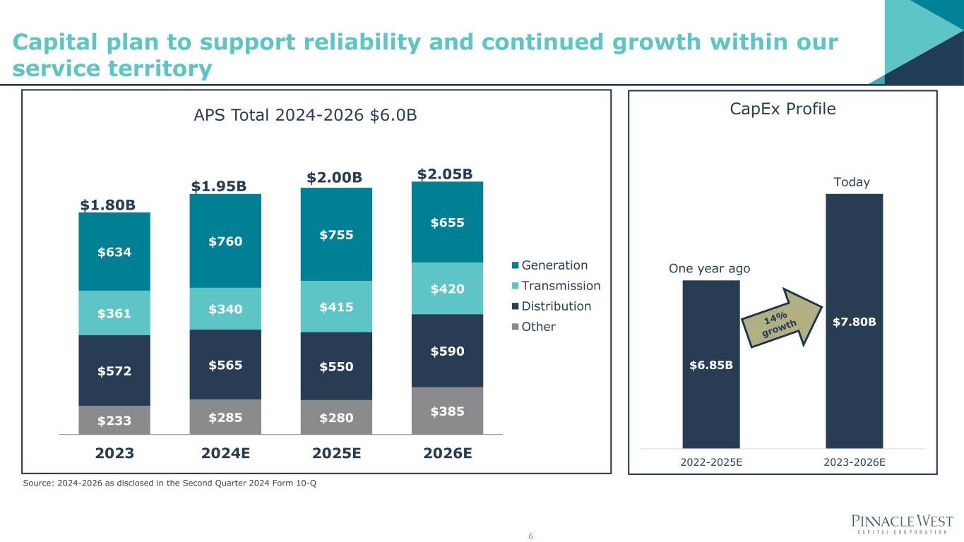 2024 EPS guidance of $4.60-$4.80 key drivers1 New rates in effect March 8, 2024 Depreciation, amortization and property taxes due to higher plant in service Retail customer growth of 1.5%-2.5% 2024 normal weather Weather-normalized retail electricity sales growth of 2.0%-4.0% (includes 2.5%- 3.5% from large C&I) Financing costs LFCR & 2019 GRC appeal outcome Operations and maintenance BCE sale Long-term guidance and key drivers • Long-term EPS growth target of 5%-7% off 2024 midpoint • Retail customer growth of 1.5%-2.5% • Weather-normalized retail electricity sales growth of 4%-6% (includes 3%-5% from large C&I customers) 0.8% 4.2% 2.4% 1.5% 2.0%-4.0% 0% 1% 2% 3% 4% 5% 6% '20 '21 '22 '23 '24E Total Sales Growth 5 1 Arrows represent expected comparative year-over-year impact of each driver on earnings. Key drivers & assumptions for 2024 EPS guidance 1 Long-term EPS growth target based on the Company’s current weather normalized compound annual growth rate projections from 2024-2028. 2 Forecasted guidance range through 2026.