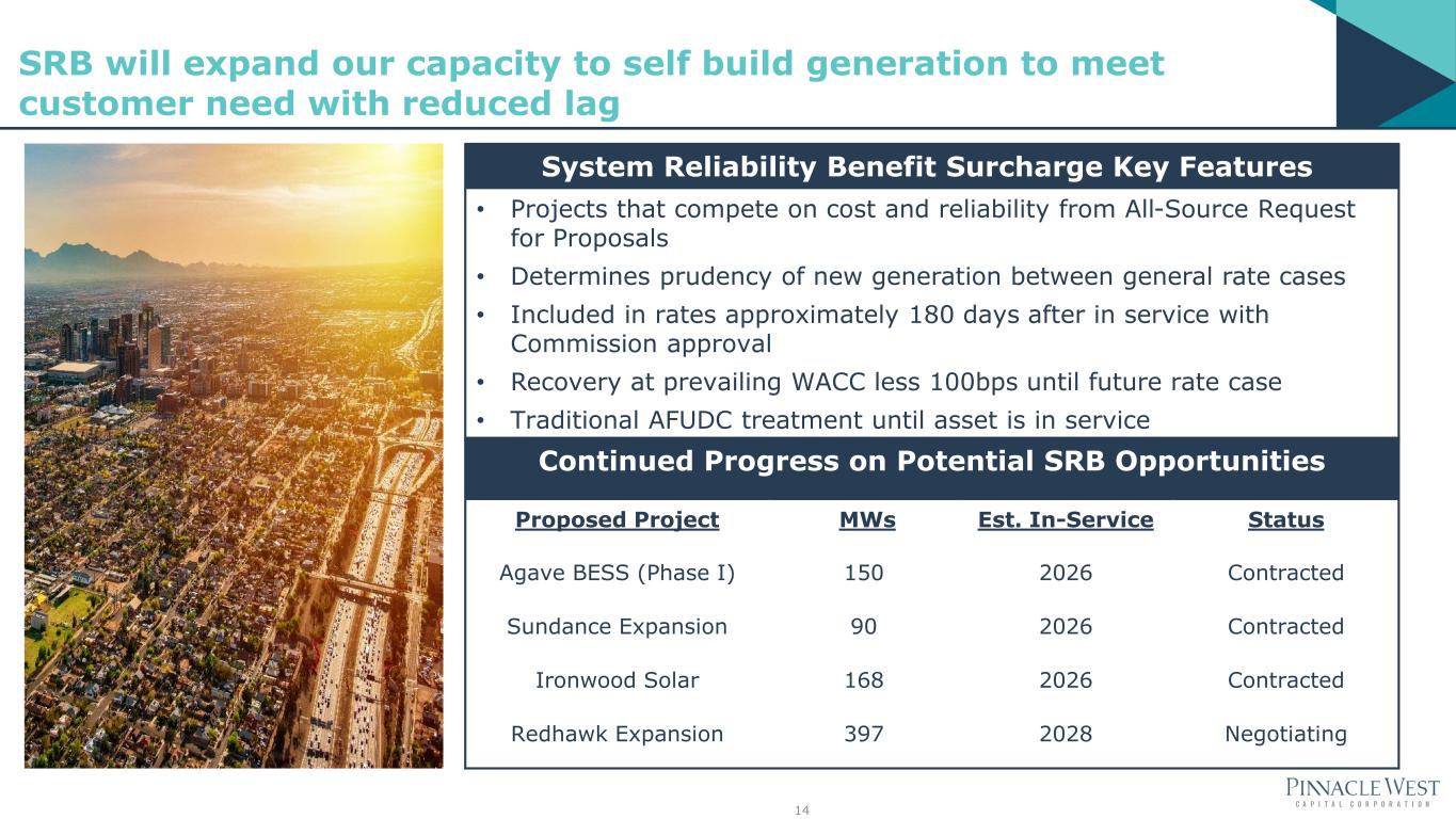 Progress Pathway 2005 2019 2030 2050 Since 2020, have contracted over 5,000 MW of clean energy and storage to be in service for APS customers by end of 2025 Issued 2023 All-Source RFP for approximately 1,000 MW of reliable capacity, including at least 700 MW of renewable resources Successfully received approval of the System Reliability Benefit Surcharge that will expand our capacity to self-build generation to meet customer need with reduced lag 24% 50% 65% 100% 13 We are making progress towards our Clean Energy Commitment