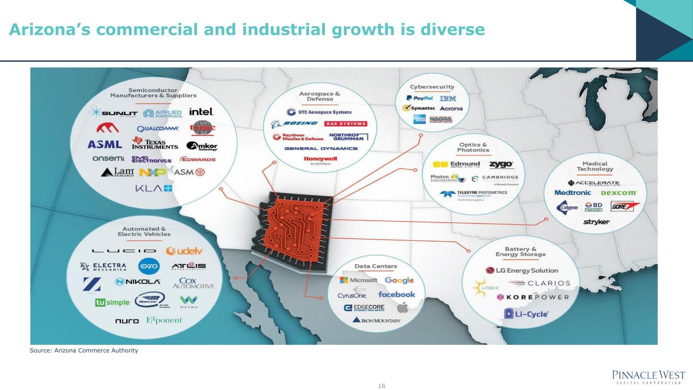 2.1% 2.3% 2.4% 2.2% 2.1% 1.5%-2.5% 0% 1% 2% 3% 2019 2020 2021 2022 2023 2024E Residential Customer Growth1 APS Residential Growth Natn'l Avg.-Residential 15 • Maricopa County ranked #1 for economic development by Site Selection magazine • In 2023, Maricopa County was the fourth fastest-growing county in the nation • Phoenix housing is affordable compared to major cities in the region • Phoenix is ranked #1 out of 15 top growth markets for manufacturing by Newmark Group, a global real estate firm • Maricopa County leads the nation in attracting talent according to Lightcast, a global leader in labor market analytics Arizona economy continues to be robust and attractive 1 National average from 2023 Itron Annual Energy Survey Report. Arizona continues to be an attractive service territory with strong customer growth