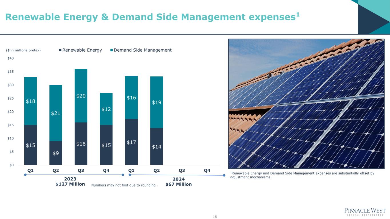 0 500 1,000 1,500 2,000 2,500 3,000 3,500 4,000 4,500 5,000 Jan Feb Mar Apr May Jun Jul Aug Sep Oct Nov Dec 2021 Applications 2022 Applications 2023 Applications 2024 Applications 169 200 216 60 2021 2022 2023 2024 1 Monthly data equals applications received minus cancelled applications. As of June 30, 2024, approximately 180,649 residential grid-tied solar photovoltaic (PV) systems have been installed in APS’s service territory, totaling approximately 1,608 MWdc of installed capacity. Excludes APS Solar Partner Program, APS Solar Communities, and Flagstaff Community Partnership Program. Note: www.arizonagoessolar.org logs total residential application volume, including cancellations. Residential DG (MWdc) Annual Additions 17 Residential PV Applications