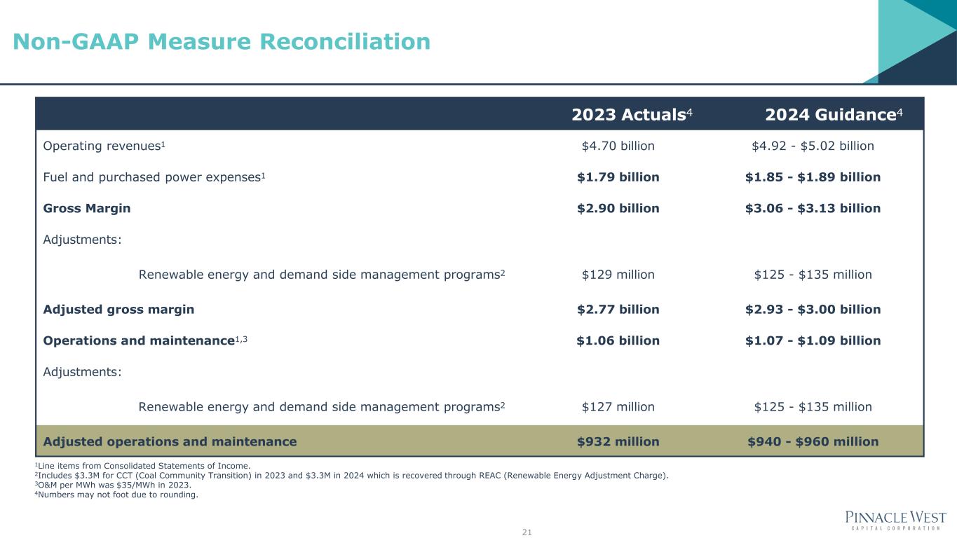 Q2 Plant Unit Actual Duration in Days West Phoenix CC5 47 Palo Verde 3 37 Q1 Plant Unit Actual Duration in Days Redhawk CC1 66 West Phoenix CC5 71 Q4 Plant Unit Estimated Duration in Days Palo Verde 2 36 Four Corners 5 66 Coal, Nuclear and Large Gas Planned Outages 20 2024 Planned Outage Schedule