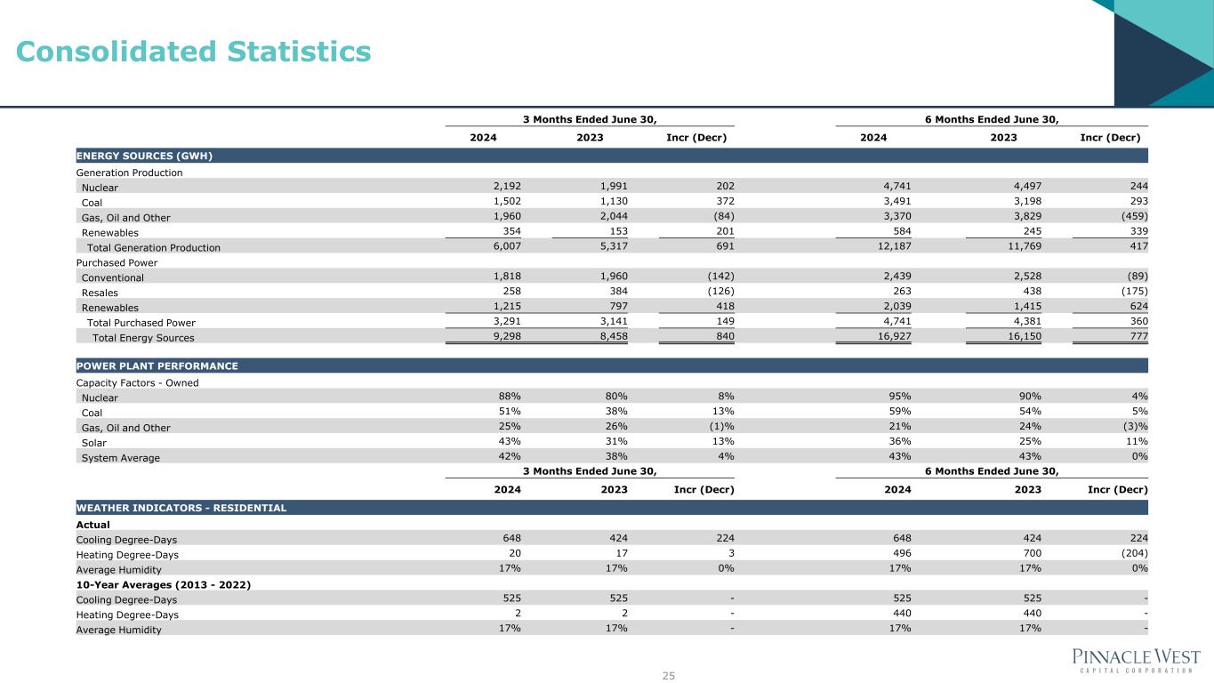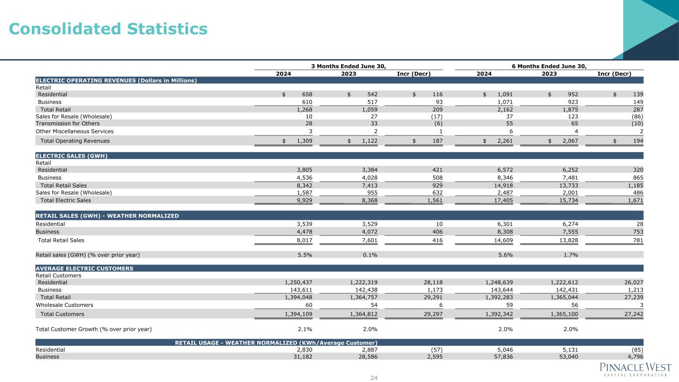 24 Consolidated Statistics 3 Months Ended June 30, 6 Months Ended June 30, 2024 2023 Incr (Decr) 2024 2023 Incr (Decr) ELECTRIC OPERATING REVENUES (Dollars in Millions) Retail Residential $ 658 $ 542 $ 116 $ 1,091 $ 952 $ 139 Business 610 517 93 1,071 923 149 Total Retail 1,268 1,059 209 2,162 1,875 287 Sales for Resale (Wholesale) 10 27 (17) 37 123 (86) Transmission for Others 28 33 (6) 55 65 (10) Other Miscellaneous Services 3 2 1 6 4 2 Total Operating Revenues $ 1,309 $ 1,122 $ 187 $ 2,261 $ 2,067 $ 194 ELECTRIC SALES (GWH) Retail Residential 3,805 3,384 421 6,572 6,252 320 Business 4,536 4,028 508 8,346 7,481 865 Total Retail Sales 8,342 7,413 929 14,918 13,733 1,185 Sales for Resale (Wholesale) 1,587 955 632 2,487 2,001 486 Total Electric Sales 9,929 8,368 1,561 17,405 15,734 1,671 RETAIL SALES (GWH) - WEATHER NORMALIZED Residential 3,539 3,529 10 6,301 6,274 28 Business 4,478 4,072 406 8,308 7,555 753 Total Retail Sales 8,017 7,601 416 14,609 13,828 781 Retail sales (GWH) (% over prior year) 5.5% 0.1% 5.6% 1.7% AVERAGE ELECTRIC CUSTOMERS Retail Customers Residential 1,250,437 1,222,319 28,118 1,248,639 1,222,612 26,027 Business 143,611 142,438 1,173 143,644 142,431 1,213 Total Retail 1,394,048 1,364,757 29,291 1,392,283 1,365,044 27,239 Wholesale Customers 60 54 6 59 56 3 Total Customers 1,394,109 1,364,812 29,297 1,392,342 1,365,100 27,242 Total Customer Growth (% over prior year) 2.1% 2.0% 2.0% 2.0% RETAIL USAGE - WEATHER NORMALIZED (KWh/Average Customer) Residential 2,830 2,887 (57) 5,046 5,131 (85) Business 31,182 28,586 2,595 57,836 53,040 4,796