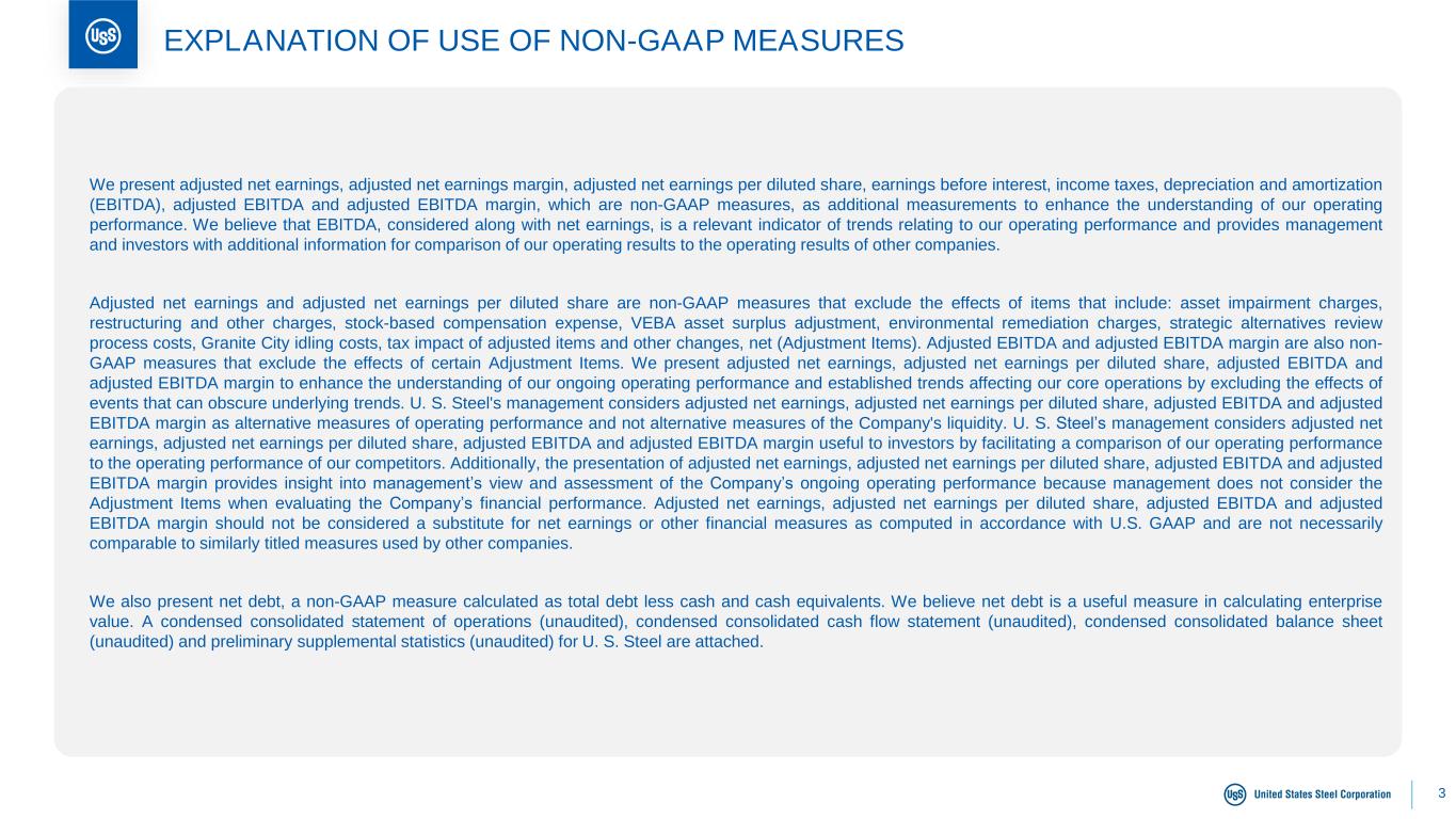 3 EXPLANATION OF USE OF NON-GAAP MEASURES We present adjusted net earnings, adjusted net earnings margin, adjusted net earnings per diluted share, earnings before interest, income taxes, depreciation and amortization (EBITDA), adjusted EBITDA and adjusted EBITDA margin, which are non-GAAP measures, as additional measurements to enhance the understanding of our operating performance. We believe that EBITDA, considered along with net earnings, is a relevant indicator of trends relating to our operating performance and provides management and investors with additional information for comparison of our operating results to the operating results of other companies. Adjusted net earnings and adjusted net earnings per diluted share are non-GAAP measures that exclude the effects of items that include: asset impairment charges, restructuring and other charges, stock-based compensation expense, VEBA asset surplus adjustment, environmental remediation charges, strategic alternatives review process costs, Granite City idling costs, tax impact of adjusted items and other changes, net (Adjustment Items). Adjusted EBITDA and adjusted EBITDA margin are also non- GAAP measures that exclude the effects of certain Adjustment Items. We present adjusted net earnings, adjusted net earnings per diluted share, adjusted EBITDA and adjusted EBITDA margin to enhance the understanding of our ongoing operating performance and established trends affecting our core operations by excluding the effects of events that can obscure underlying trends. U. S. Steel's management considers adjusted net earnings, adjusted net earnings per diluted share, adjusted EBITDA and adjusted EBITDA margin as alternative measures of operating performance and not alternative measures of the Company's liquidity. U. S. Steel’s management considers adjusted net earnings, adjusted net earnings per diluted share, adjusted EBITDA and adjusted EBITDA margin useful to investors by facilitating a comparison of our operating performance to the operating performance of our competitors. Additionally, the presentation of adjusted net earnings, adjusted net earnings per diluted share, adjusted EBITDA and adjusted EBITDA margin provides insight into management’s view and assessment of the Company’s ongoing operating performance because management does not consider the Adjustment Items when evaluating the Company’s financial performance. Adjusted net earnings, adjusted net earnings per diluted share, adjusted EBITDA and adjusted EBITDA margin should not be considered a substitute for net earnings or other financial measures as computed in accordance with U.S. GAAP and are not necessarily comparable to similarly titled measures used by other companies. We also present net debt, a non-GAAP measure calculated as total debt less cash and cash equivalents. We believe net debt is a useful measure in calculating enterprise value. A condensed consolidated statement of operations (unaudited), condensed consolidated cash flow statement (unaudited), condensed consolidated balance sheet (unaudited) and preliminary supplemental statistics (unaudited) for U. S. Steel are attached.