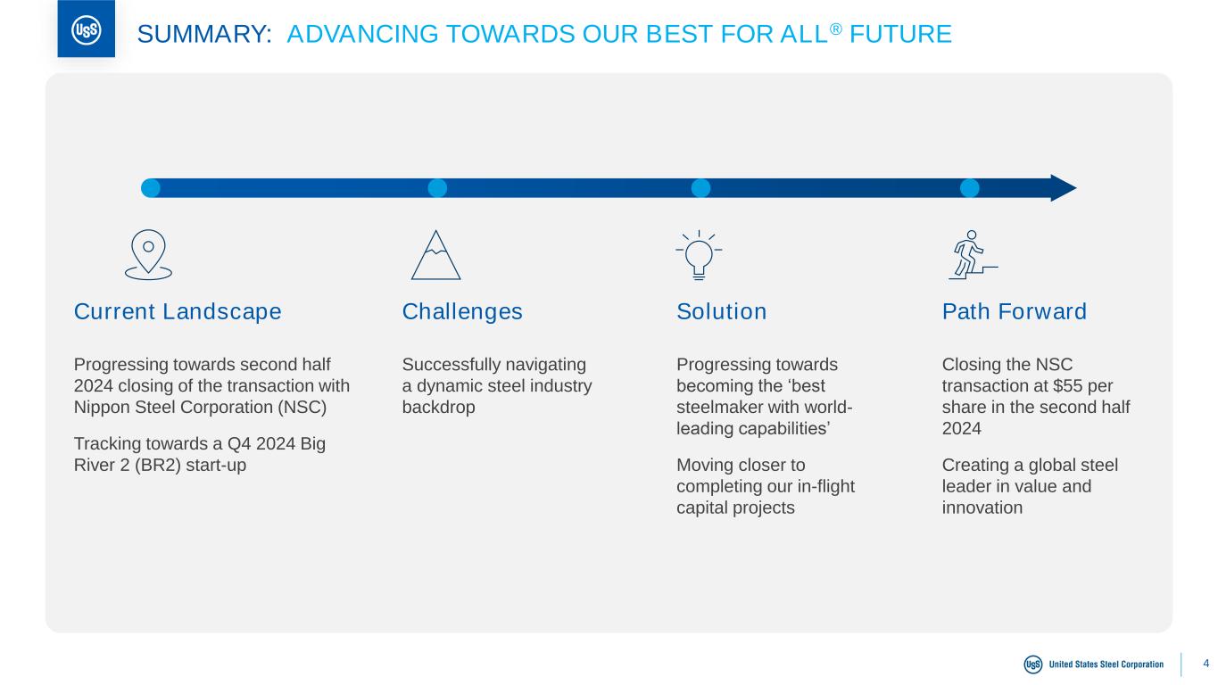 Commenting on the Company’s transaction with Nippon Steel Corporation, Burritt noted, “We continue to make progress on the U.S. regulatory processes ahead of the anticipated closing of our transaction with Nippon Steel Corporation later this year, which will bring advanced technologies to U. S. Steel to support a stronger domestic steel industry with enhanced competition and will strengthen national, economic, and job security.”