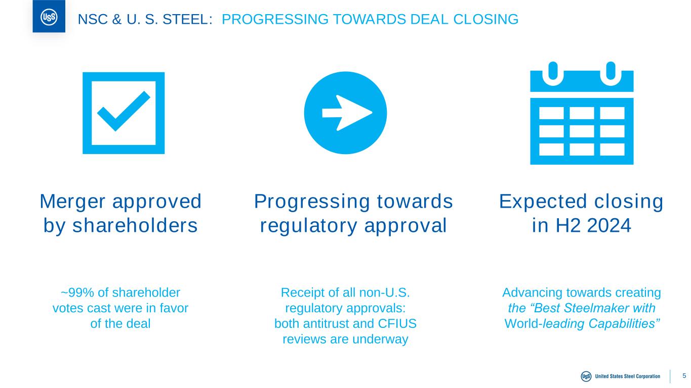 4 SUMMARY: ADVANCING TOWARDS OUR BEST FOR ALL® FUTURE Current Landscape Progressing towards second half 2024 closing of the transaction with Nippon Steel Corporation (NSC) Tracking towards a Q4 2024 Big River 2 (BR2) start-up Challenges Successfully navigating a dynamic steel industry backdrop Solution Progressing towards becoming the ‘best steelmaker with world- leading capabilities’ Moving closer to completing our in-flight capital projects Path Forward Closing the NSC transaction at $55 per share in the second half 2024 Creating a global steel leader in value and innovation