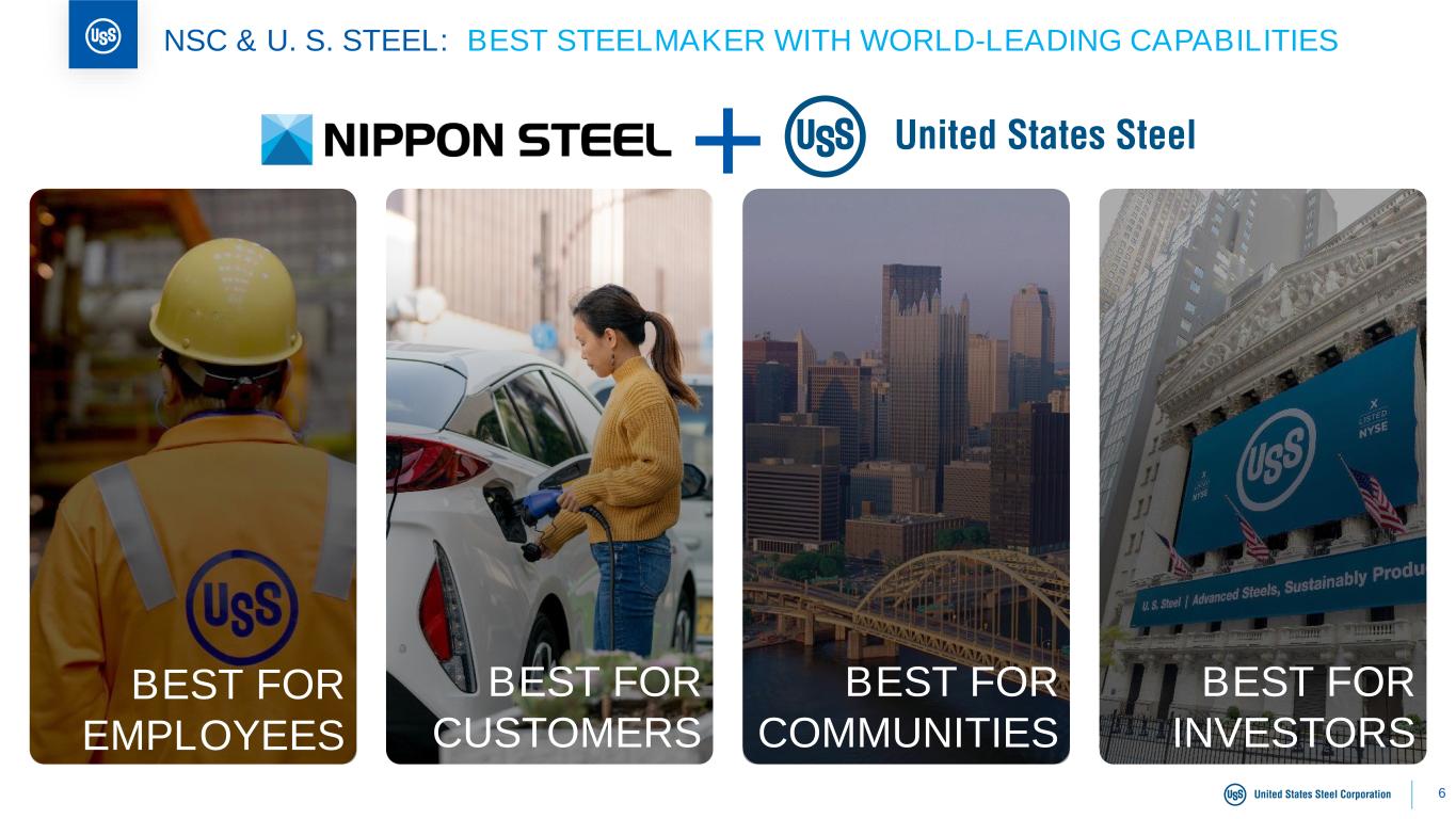 5 NSC & U. S. STEEL: PROGRESSING TOWARDS DEAL CLOSING Merger approved by shareholders Progressing towards regulatory approval ~99% of shareholder votes cast were in favor of the deal Receipt of all non-U.S. regulatory approvals: both antitrust and CFIUS reviews are underway Expected closing in H2 2024 Advancing towards creating the “Best Steelmaker with World-leading Capabilities”