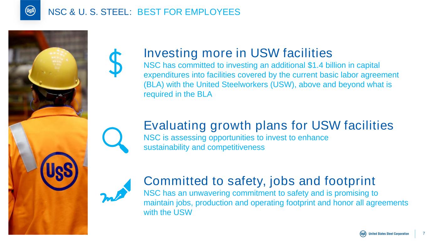6 NSC & U. S. STEEL: BEST STEELMAKER WITH WORLD-LEADING CAPABILITIES BEST FOR EMPLOYEES BEST FOR COMMUNITIES BEST FOR INVESTORS + BEST FOR CUSTOMERS