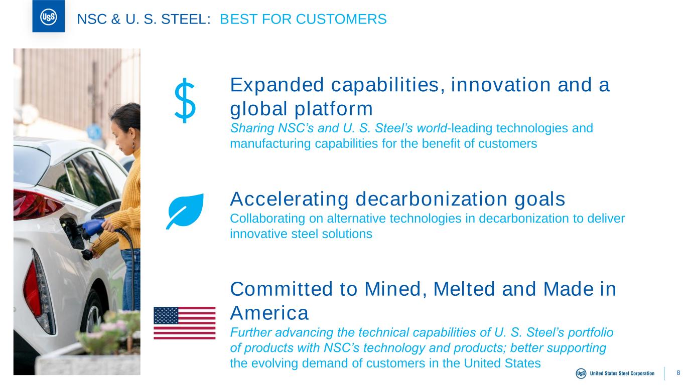 7 NSC & U. S. STEEL: BEST FOR EMPLOYEES Investing more in USW facilities NSC has committed to investing an additional $1.4 billion in capital expenditures into facilities covered by the current basic labor agreement (BLA) with the United Steelworkers (USW), above and beyond what is required in the BLA Evaluating growth plans for USW facilities NSC is assessing opportunities to invest to enhance sustainability and competitiveness Committed to safety, jobs and footprint NSC has an unwavering commitment to safety and is promising to maintain jobs, production and operating footprint and honor all agreements with the USW