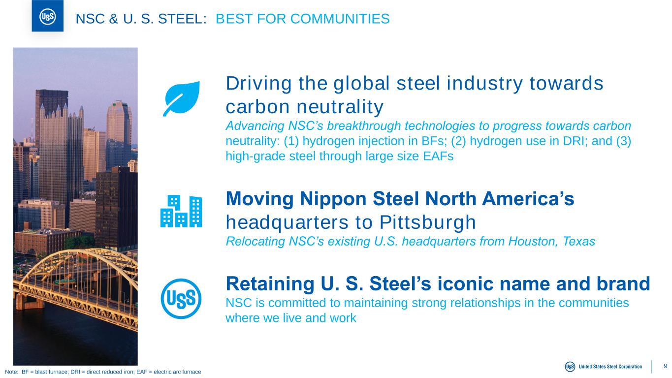 8 NSC & U. S. STEEL: BEST FOR CUSTOMERS Expanded capabilities, innovation and a global platform Sharing NSC’s and U. S. Steel’s world-leading technologies and manufacturing capabilities for the benefit of customers Accelerating decarbonization goals Collaborating on alternative technologies in decarbonization to deliver innovative steel solutions Committed to Mined, Melted and Made in America Further advancing the technical capabilities of U. S. Steel’s portfolio of products with NSC’s technology and products; better supporting the evolving demand of customers in the United States