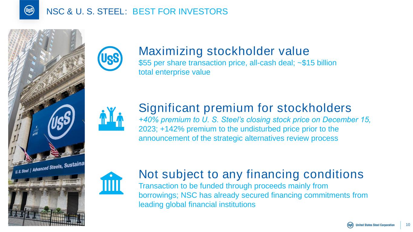 9 NSC & U. S. STEEL: BEST FOR COMMUNITIES Driving the global steel industry towards carbon neutrality Advancing NSC’s breakthrough technologies to progress towards carbon neutrality: (1) hydrogen injection in BFs; (2) hydrogen use in DRI; and (3) high-grade steel through large size EAFs Moving Nippon Steel North America’s headquarters to Pittsburgh Relocating NSC’s existing U.S. headquarters from Houston, Texas Retaining U. S. Steel’s iconic name and brand NSC is committed to maintaining strong relationships in the communities where we live and work Note: BF = blast furnace; DRI = direct reduced iron; EAF = electric arc furnace