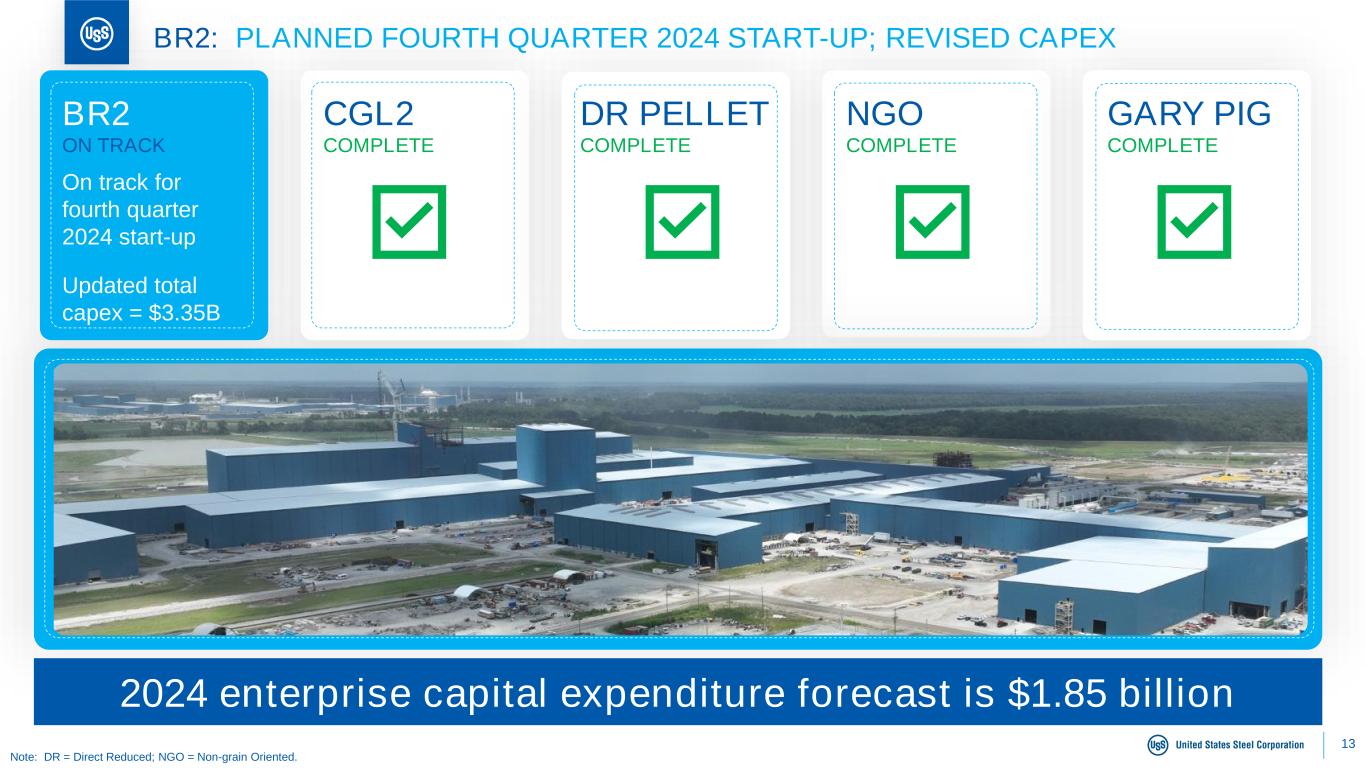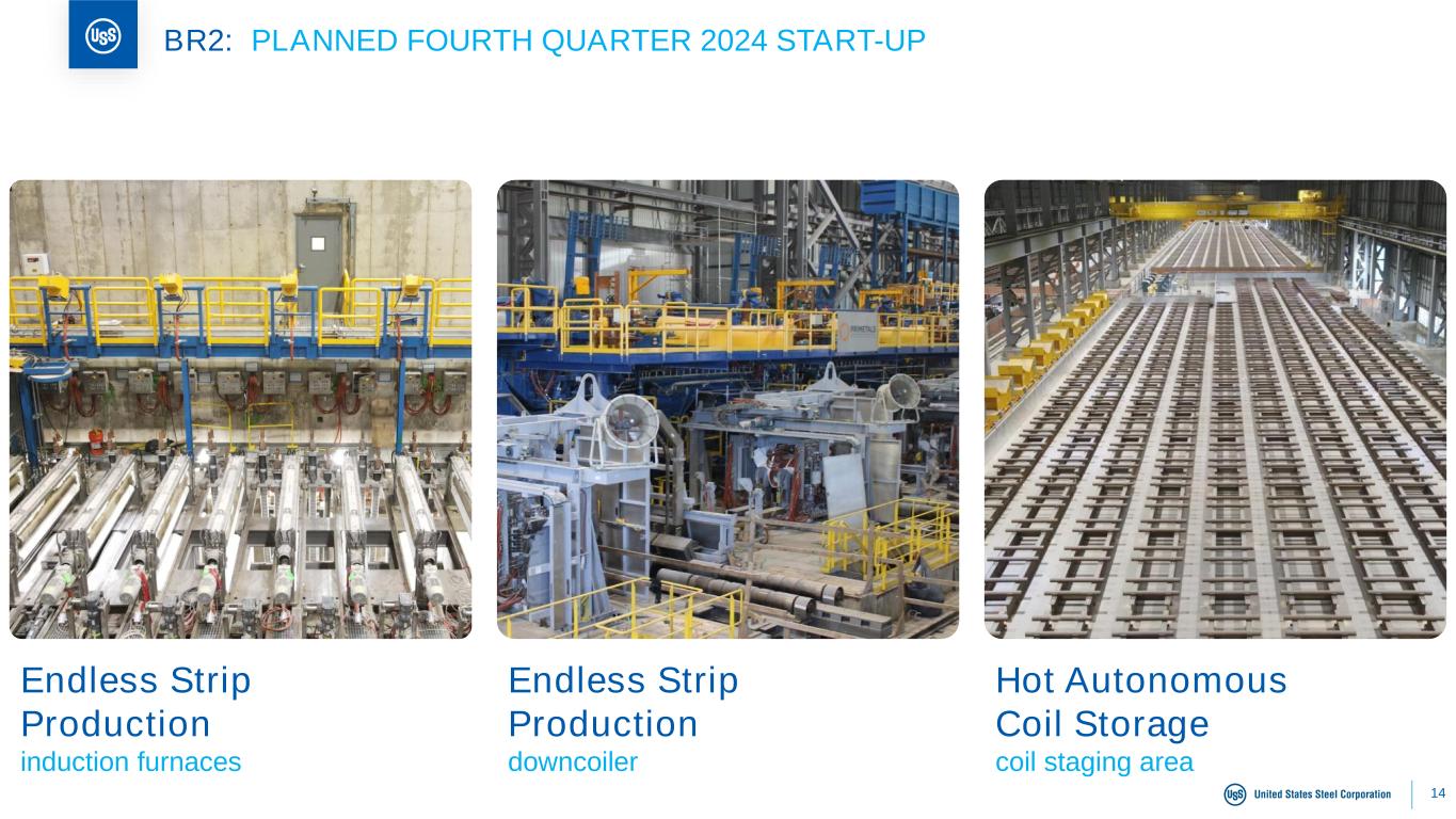 13 BR2: PLANNED FOURTH QUARTER 2024 START-UP; REVISED CAPEX Note: DR = Direct Reduced; NGO = Non-grain Oriented. CGL2 COMPLETE NGO COMPLETE GARY PIG COMPLETE DR PELLET COMPLETE On track for fourth quarter 2024 start-up Updated total capex = $3.35B BR2 ON TRACK 2024 enterprise capital expenditure forecast is $1.85 billion
