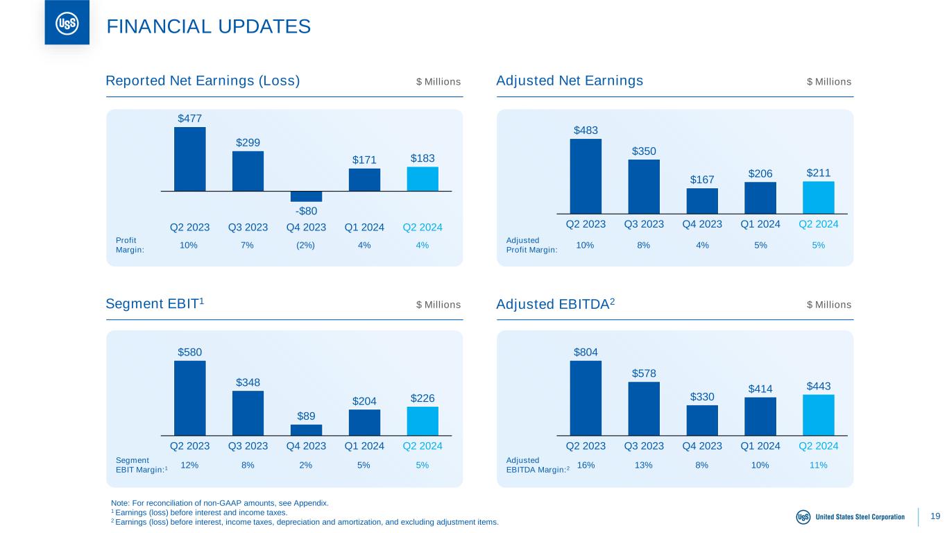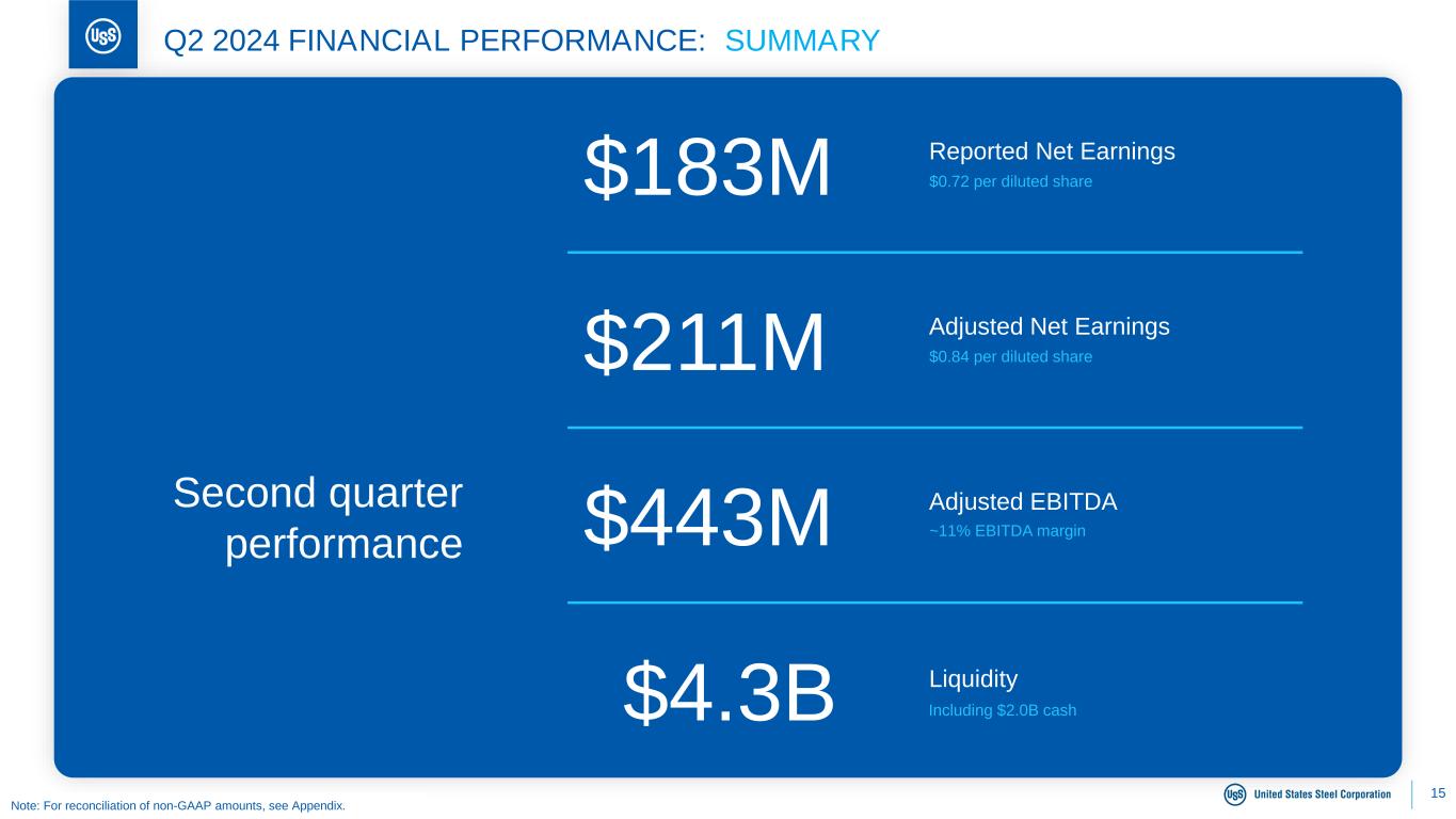 PITTSBURGH, August 1, 2024 – United States Steel Corporation (NYSE: X) reported second quarter 2024 net earnings of $183 million, or $0.72 per diluted share. Adjusted net earnings was $211 million, or $0.84 per diluted share. This compares to second quarter 2023 net earnings of $477 million, or $1.89 per diluted share. Adjusted net earnings for the second quarter 2023 was $483 million, or $1.92 per diluted share.