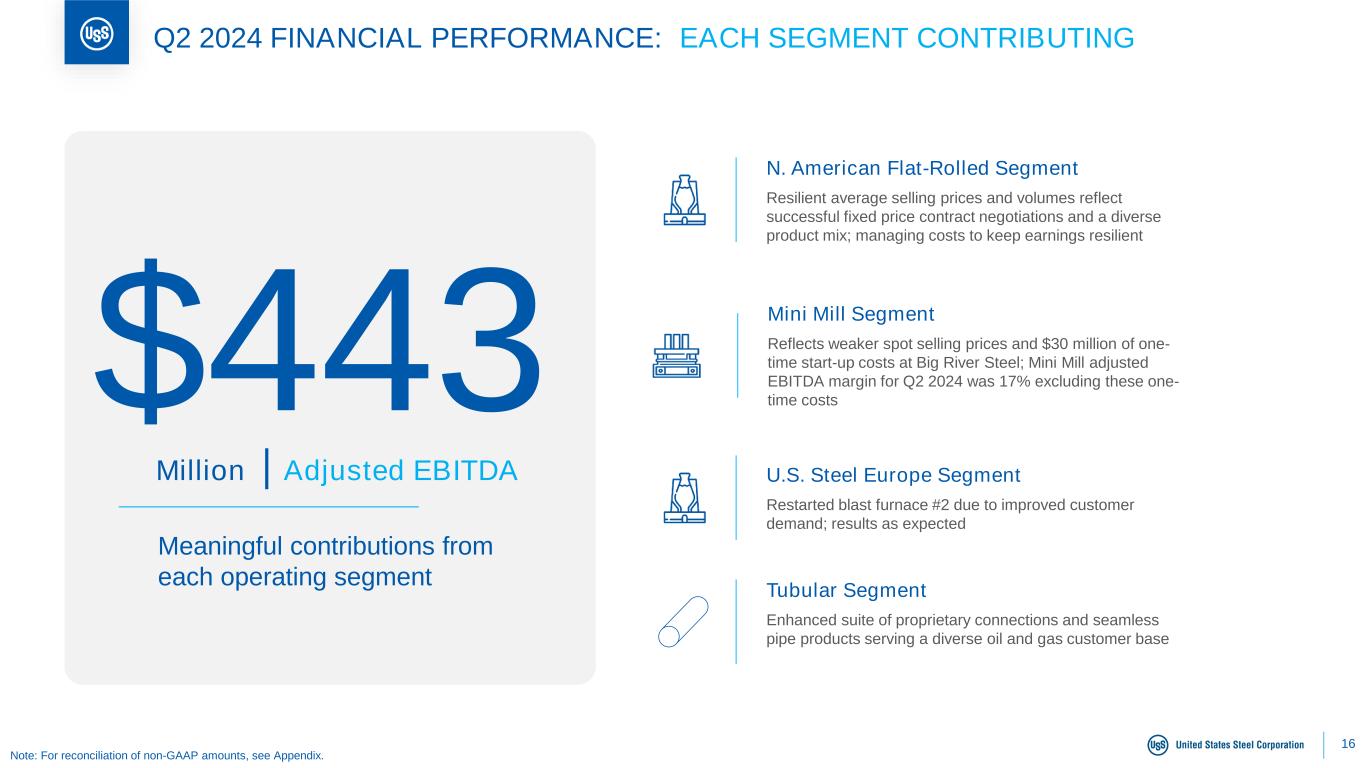 15 Q2 2024 FINANCIAL PERFORMANCE: SUMMARY $443M Adjusted EBITDA ~11% EBITDA margin Second quarter performance $183M Reported Net Earnings $0.72 per diluted share Note: For reconciliation of non-GAAP amounts, see Appendix. $211M Adjusted Net Earnings $0.84 per diluted share $4.3B Liquidity Including $2.0B cash