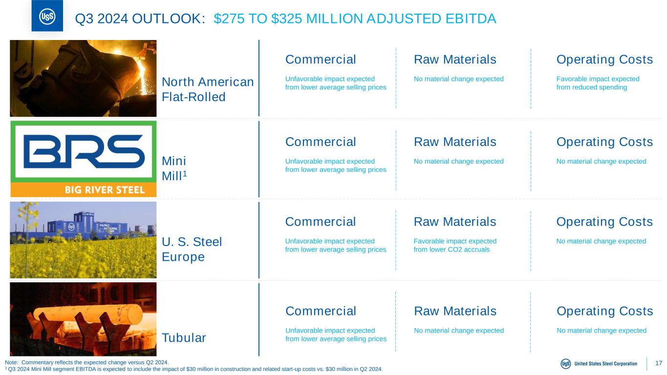 16 Q2 2024 FINANCIAL PERFORMANCE: EACH SEGMENT CONTRIBUTING Meaningful contributions from each operating segment Million Adjusted EBITDA $443 N. American Flat-Rolled Segment Resilient average selling prices and volumes reflect successful fixed price contract negotiations and a diverse product mix; managing costs to keep earnings resilient Mini Mill Segment Reflects weaker spot selling prices and $30 million of one- time start-up costs at Big River Steel; Mini Mill adjusted EBITDA margin for Q2 2024 was 17% excluding these one- time costs U.S. Steel Europe Segment Restarted blast furnace #2 due to improved customer demand; results as expected Tubular Segment Enhanced suite of proprietary connections and seamless pipe products serving a diverse oil and gas customer base Note: For reconciliation of non-GAAP amounts, see Appendix.