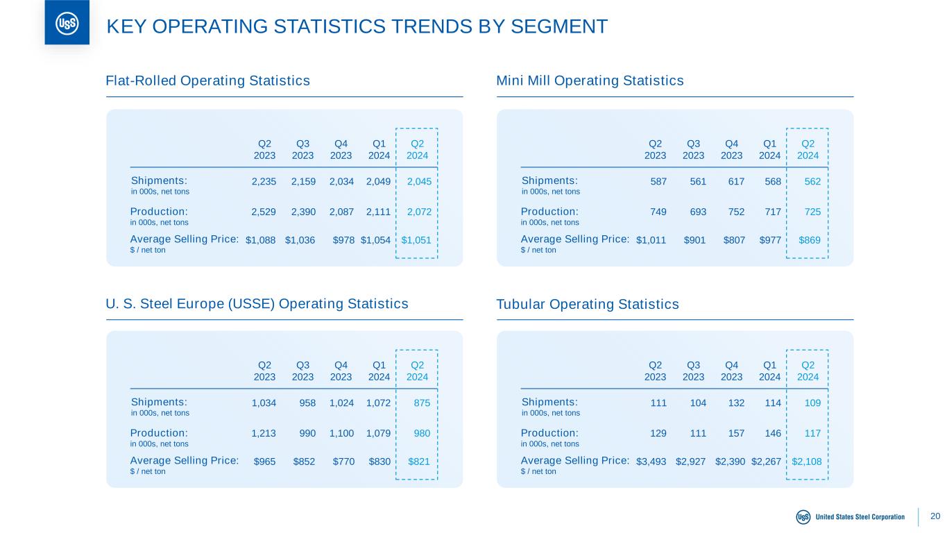 20 KEY OPERATING STATISTICS TRENDS BY SEGMENT Flat-Rolled Operating Statistics Mini Mill Operating Statistics U. S. Steel Europe (USSE) Operating Statistics Tubular Operating Statistics Shipments: in 000s, net tons Production: in 000s, net tons Average Selling Price: $ / net ton Q2 2023 2,529 2,235 $1,088 Q3 2023 2,390 2,159 $1,036 Q4 2023 2,087 2,034 $978 Q1 2024 2,111 2,049 $1,054 Q2 2024 2,072 2,045 $1,051 Shipments: in 000s, net tons Production: in 000s, net tons Average Selling Price: $ / net ton Q2 2023 749 587 $1,011 Q3 2023 693 561 $901 Q4 2023 752 617 $807 Q1 2024 717 568 $977 Q2 2024 725 562 $869 Shipments: in 000s, net tons Production: in 000s, net tons Average Selling Price: $ / net ton Q2 2023 1,213 1,034 $965 Q3 2023 990 958 $852 Q4 2023 1,100 1,024 $770 Q1 2024 1,079 1,072 $830 Q2 2024 980 875 $821 Shipments: in 000s, net tons Production: in 000s, net tons Average Selling Price: $ / net ton Q2 2023 129 111 $3,493 Q3 2023 111 104 $2,927 Q4 2023 157 132 $2,390 Q1 2024 146 114 $2,267 Q2 2024 117 109 $2,108