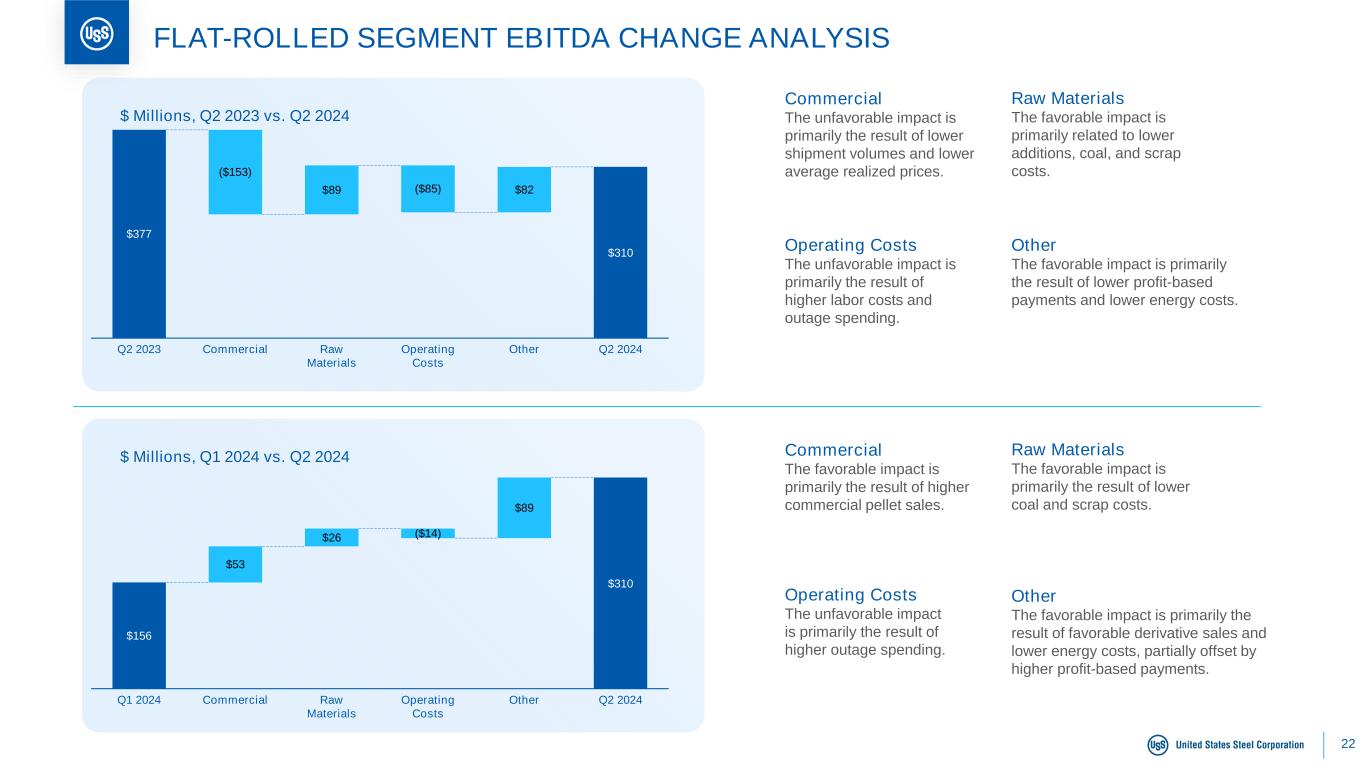 21 EBITDA TRENDS BY SEGMENT EBITDA Margin: 12% 13% 5% 6% 12% 22% 13% 12% 21% 12% 9% 1% 0% 5% 3% EBITDA Margin: 42% 32% 38% 25% 17% EBITDA Margin: Note: For reconciliation of non-GAAP amounts, see Appendix. 1 Q4 2023 North American Flat-Rolled segment includes the impact of construction and related start-up costs of approximately $10 million related to the DR-grade pellet strategic project. 2 Mini Mill segment EBITDA includes the impact of construction and related start-up costs of $12M in Q2 2023, $17M in Q3 2023, $12M in Q4 2023, $20M in Q1 2024, and $30M in Q2 2024. EBITDA Margin: $377 $378 $128 $156 $310 Q2 2023 Q3 2023 Q4 20231 Q1 2024 Q2 2024 $173 $84 $74 $145 $74 Q2 20232 Q3 20232 Q4 20232 Q1 20242 Q2 20242 $97 $10 $3 $46 $21 Q2 2023 Q3 2023 Q4 2023 Q1 2024 Q2 2024 $169 $99 $126 $69 $42 Q2 2023 Q3 2023 Q4 2023 Q1 2024 Q2 2024 Flat-Rolled Segment EBITDA Mini Mill Segment EBITDA$ Millions $ Millions USSE Segment EBITDA Tubular Segment EBITDA$ Millions $ Millions 17% EBITDA margin excluding $30M of Q2 2024 construction and related start-up costs