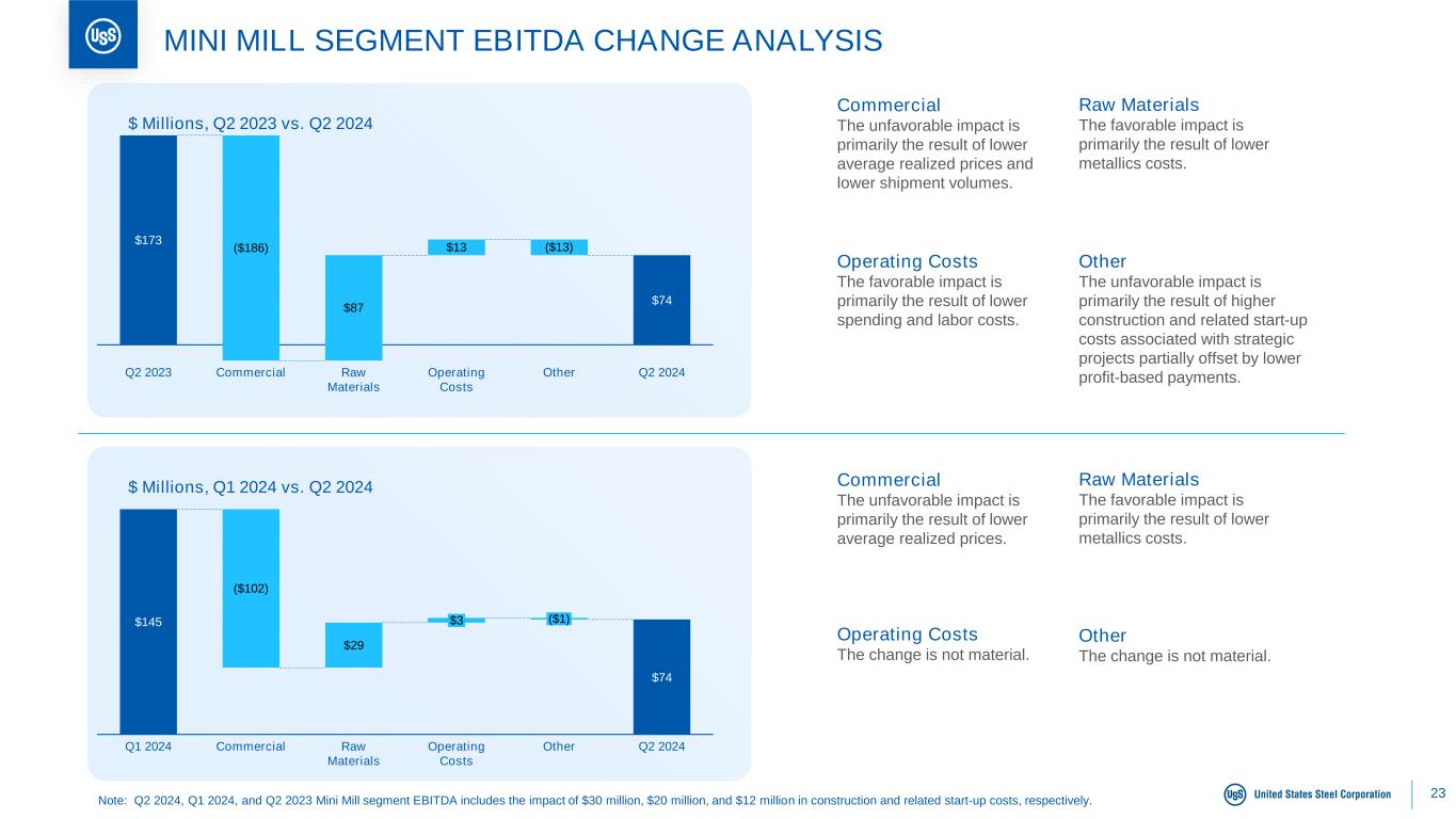 22 $ Millions, Q1 2024 vs. Q2 2024 FLAT-ROLLED SEGMENT EBITDA CHANGE ANALYSIS Commercial The unfavorable impact is primarily the result of lower shipment volumes and lower average realized prices. Raw Materials The favorable impact is primarily related to lower additions, coal, and scrap costs. Operating Costs The unfavorable impact is primarily the result of higher labor costs and outage spending. $377 $310 $89 $82 Q2 2023 ($153) Commercial Raw Materials ($85) Operating Costs Other Q2 2024 Other The favorable impact is primarily the result of lower profit-based payments and lower energy costs. Commercial The favorable impact is primarily the result of higher commercial pellet sales. Raw Materials The favorable impact is primarily the result of lower coal and scrap costs. Operating Costs The unfavorable impact is primarily the result of higher outage spending. Other The favorable impact is primarily the result of favorable derivative sales and lower energy costs, partially offset by higher profit-based payments. $ Millions, Q2 2023 vs. Q2 2024 $156 $310 $53 $26 $89 Q1 2024 Commercial Raw Materials ($14) Operating Costs Other Q2 2024