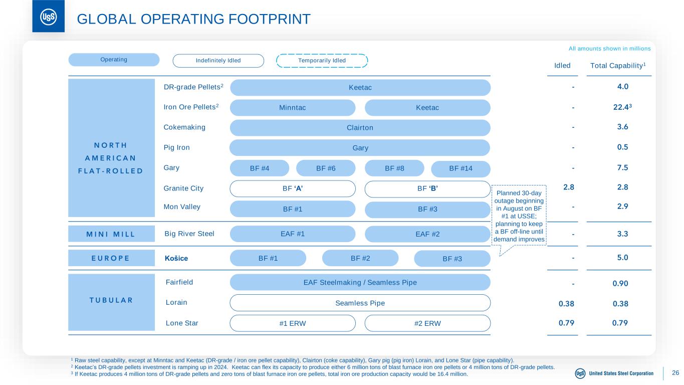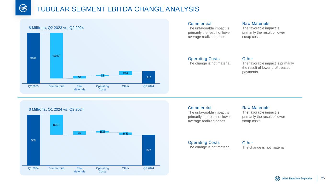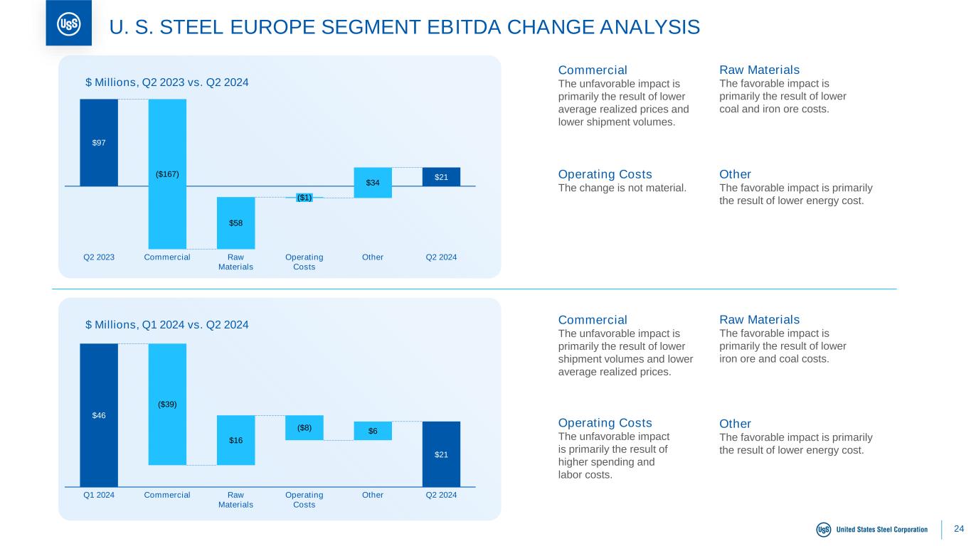 24 $46 $21 $16 $6 Q1 2024 ($39) Commercial Raw Materials ($8) Operating Costs Other Q2 2024 $ Millions, Q1 2024 vs. Q2 2024 U. S. STEEL EUROPE SEGMENT EBITDA CHANGE ANALYSIS $97 $21 Q2 2023 ($167) Commercial $58 Raw Materials ($1) Operating Costs $34 Other Q2 2024 $ Millions, Q2 2023 vs. Q2 2024 Commercial The unfavorable impact is primarily the result of lower average realized prices and lower shipment volumes. Raw Materials The favorable impact is primarily the result of lower coal and iron ore costs. Operating Costs The change is not material. Other The favorable impact is primarily the result of lower energy cost. Commercial The unfavorable impact is primarily the result of lower shipment volumes and lower average realized prices. Raw Materials The favorable impact is primarily the result of lower iron ore and coal costs. Operating Costs The unfavorable impact is primarily the result of higher spending and labor costs. Other The favorable impact is primarily the result of lower energy cost.