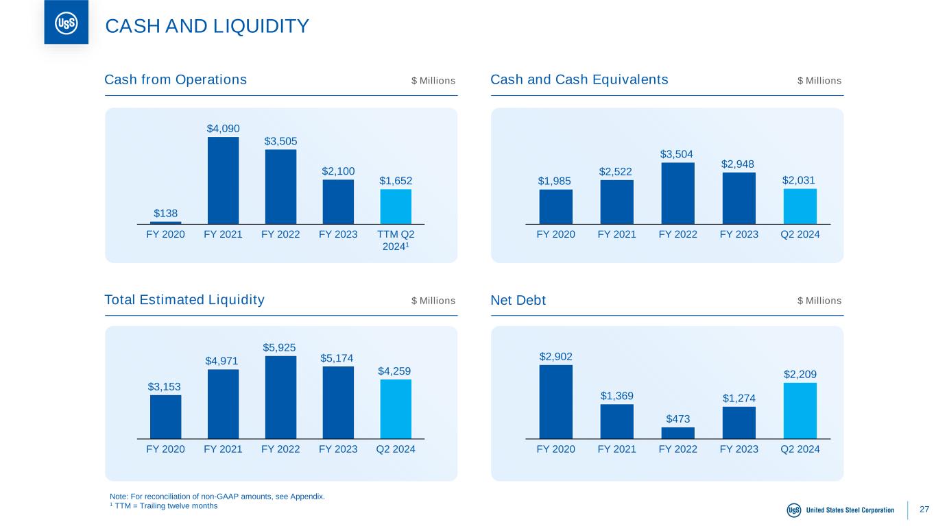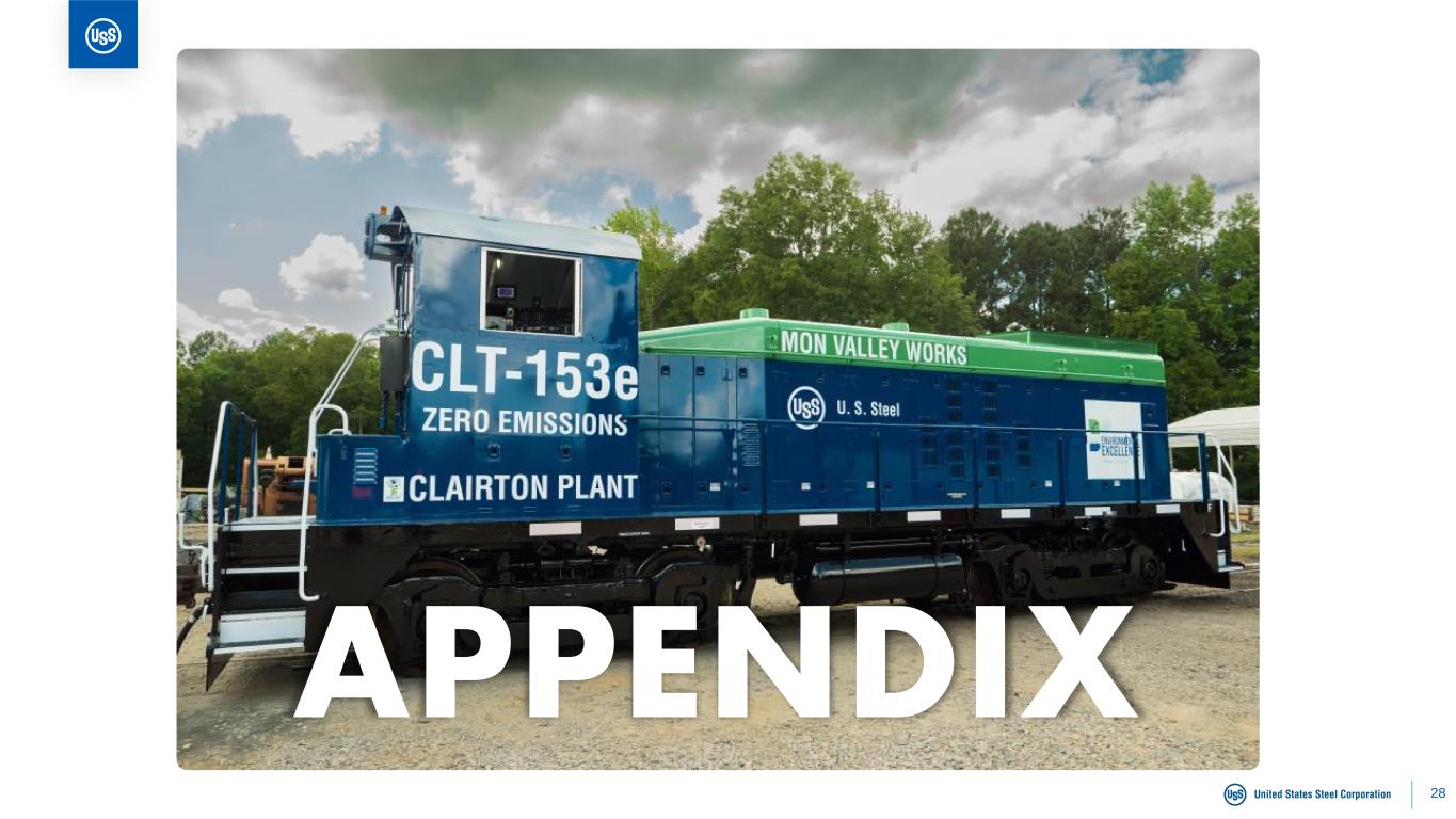 26 Minntac M I N I M I L L T U B U L A R Clairton Keetac BF #4 BF #6 BF #8 BF #14 BF ‘A’ BF ‘B’ N O R T H A M E R I C A N F L A T - R O L L E D BF #1 BF #3 EAF #1 EAF #2 BF #1 BF #3BF #2 Seamless Pipe #1 ERW #2 ERW EAF Steelmaking / Seamless Pipe Indefinitely IdledOperating 1 Raw steel capability, except at Minntac and Keetac (DR-grade / iron ore pellet capability), Clairton (coke capability), Gary pig (pig iron) Lorain, and Lone Star (pipe capability). 2 Keetac’s DR-grade pellets investment is ramping up in 2024. Keetac can flex its capacity to produce either 6 million tons of blast furnace iron ore pellets or 4 million tons of DR-grade pellets. 3 If Keetac produces 4 million tons of DR-grade pellets and zero tons of blast furnace iron ore pellets, total iron ore production capacity would be 16.4 million. 22.43 3.6 7.5 2.8 2.9 - - - 2.8 - 0.90 0.38 0.79 - 0.38 0.79 5.0- 3.3- Iron Ore Pellets2 Cokemaking Gary Granite City Mon Valley Big River Steel Košice Lorain Lone Star Fairfield E U R O P E Idled Total Capability1 GLOBAL OPERATING FOOTPRINT Temporarily Idled GaryPig Iron - 0.5 Keetac 4.0-DR-grade Pellets2 All amounts shown in millions Planned 30-day outage beginning in August on BF #1 at USSE; planning to keep a BF off-line until demand improves