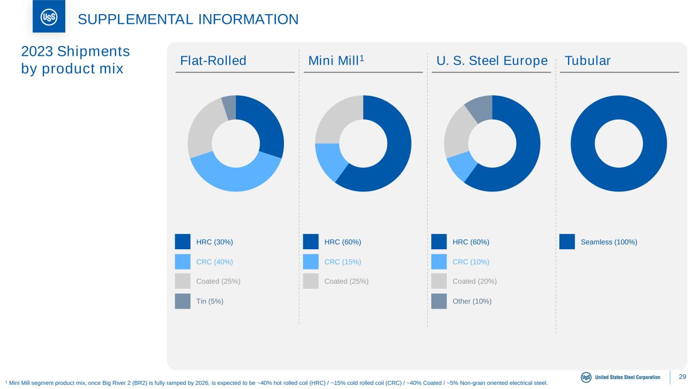 29 SUPPLEMENTAL INFORMATION HRC (30%) CRC (40%) Coated (25%) Tin (5%) HRC (60%) CRC (15%) Coated (25%) HRC (60%) CRC (10%) Coated (20%) Other (10%) Seamless (100%) Flat-Rolled Mini Mill1 U. S. Steel Europe Tubular 2023 Shipments by product mix 1 Mini Mill segment product mix, once Big River 2 (BR2) is fully ramped by 2026, is expected to be ~40% hot rolled coil (HRC) / ~15% cold rolled coil (CRC) / ~40% Coated / ~5% Non-grain oriented electrical steel.