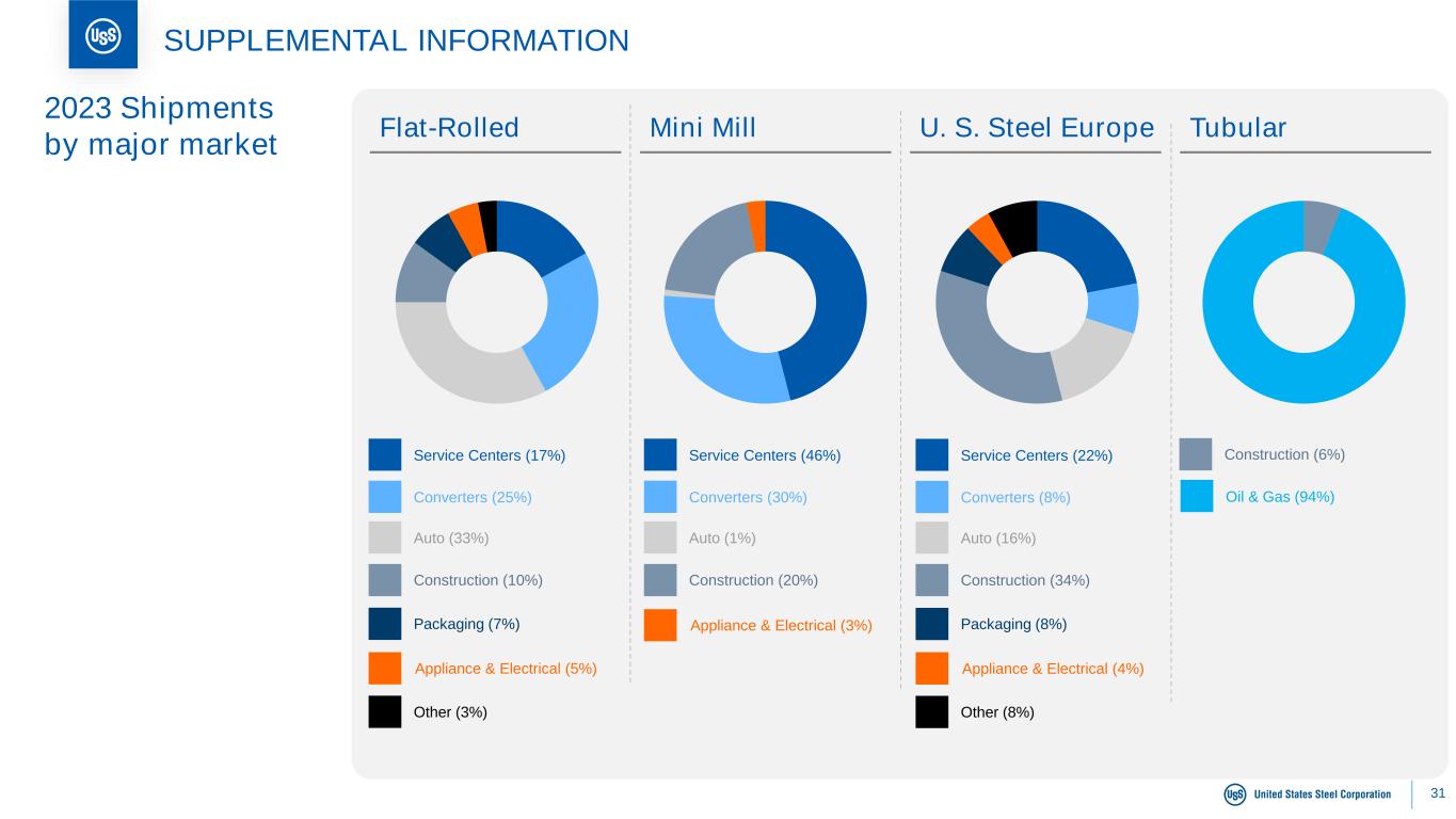 30 SUPPLEMENTAL INFORMATION HRC (20%) CRC (40%) Coated (30%) Other (5%) HRC (55%) CRC (15%) Coated (30%) HRC (45%) CRC (10%) Coated (35%) Other (5%) Tubular Product (100%) Flat-Rolled Mini Mill U. S. Steel Europe Tubular 2023 Revenue by product mix Semi-finished (5%) Semi-finished (5%)