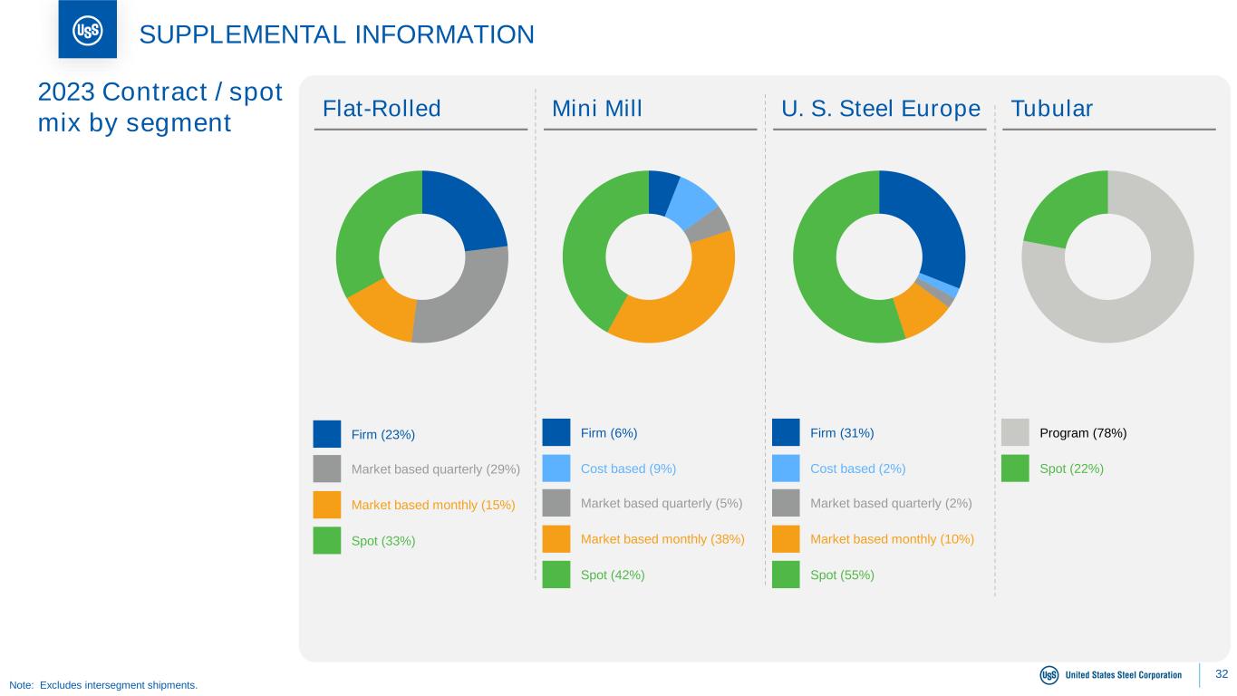 31 SUPPLEMENTAL INFORMATION Service Centers (17%) Converters (25%) Auto (33%) Construction (10%) Oil & Gas (94%) Flat-Rolled Mini Mill U. S. Steel Europe Tubular 2023 Shipments by major market Packaging (7%) Appliance & Electrical (5%) Other (3%) Service Centers (46%) Converters (30%) Auto (1%) Construction (20%) Appliance & Electrical (3%) Service Centers (22%) Converters (8%) Auto (16%) Construction (34%) Packaging (8%) Appliance & Electrical (4%) Other (8%) Construction (6%)