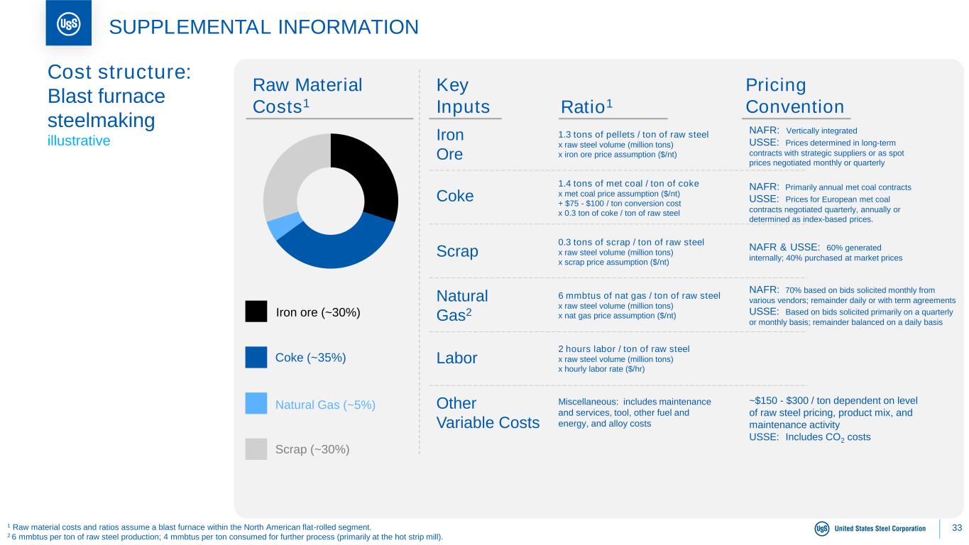 32 SUPPLEMENTAL INFORMATION Firm (23%) Market based quarterly (29%) Market based monthly (15%) Spot (33%) Firm (6%) Cost based (9%) Market based quarterly (5%) Market based monthly (38%) Spot (42%) Firm (31%) Cost based (2%) Market based quarterly (2%) Market based monthly (10%) Spot (55%) Program (78%) Spot (22%) Flat-Rolled Mini Mill U. S. Steel Europe Tubular 2023 Contract / spot mix by segment Note: Excludes intersegment shipments.
