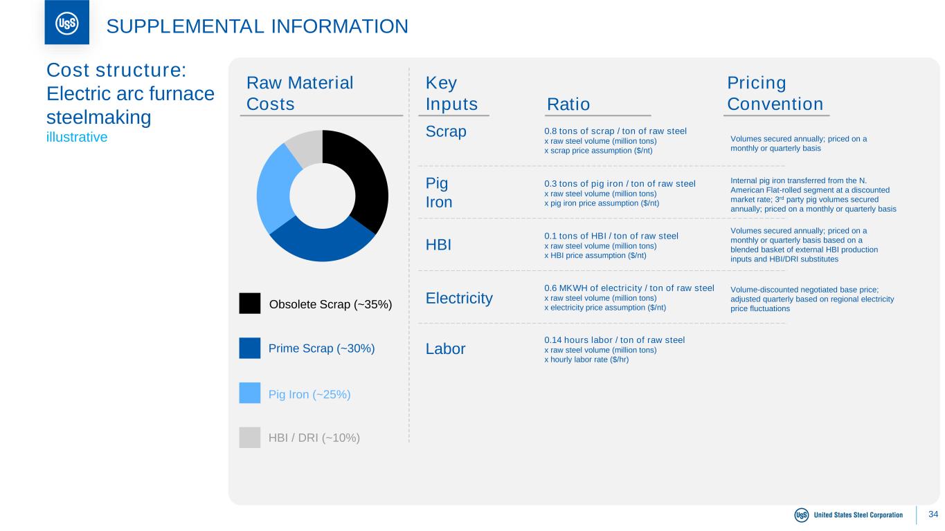 33 SUPPLEMENTAL INFORMATION Cost structure: Blast furnace steelmaking illustrative Coke (~35%) Natural Gas (~5%) Scrap (~30%) Raw Material Costs1 Iron ore (~30%) Key Inputs Ratio1 Pricing Convention Iron Ore 1.3 tons of pellets / ton of raw steel x raw steel volume (million tons) x iron ore price assumption ($/nt) NAFR: Vertically integrated USSE: Prices determined in long-term contracts with strategic suppliers or as spot prices negotiated monthly or quarterly Coke Scrap Natural Gas2 1.4 tons of met coal / ton of coke x met coal price assumption ($/nt) + $75 - $100 / ton conversion cost x 0.3 ton of coke / ton of raw steel 0.3 tons of scrap / ton of raw steel x raw steel volume (million tons) x scrap price assumption ($/nt) 6 mmbtus of nat gas / ton of raw steel x raw steel volume (million tons) x nat gas price assumption ($/nt) Labor 2 hours labor / ton of raw steel x raw steel volume (million tons) x hourly labor rate ($/hr) Other Variable Costs ~$150 - $300 / ton dependent on level of raw steel pricing, product mix, and maintenance activity USSE: Includes CO2 costs Miscellaneous: includes maintenance and services, tool, other fuel and energy, and alloy costs NAFR: Primarily annual met coal contracts USSE: Prices for European met coal contracts negotiated quarterly, annually or determined as index-based prices. NAFR & USSE: 60% generated internally; 40% purchased at market prices NAFR: 70% based on bids solicited monthly from various vendors; remainder daily or with term agreements USSE: Based on bids solicited primarily on a quarterly or monthly basis; remainder balanced on a daily basis 1 Raw material costs and ratios assume a blast furnace within the North American flat-rolled segment. 2 6 mmbtus per ton of raw steel production; 4 mmbtus per ton consumed for further process (primarily at the hot strip mill).