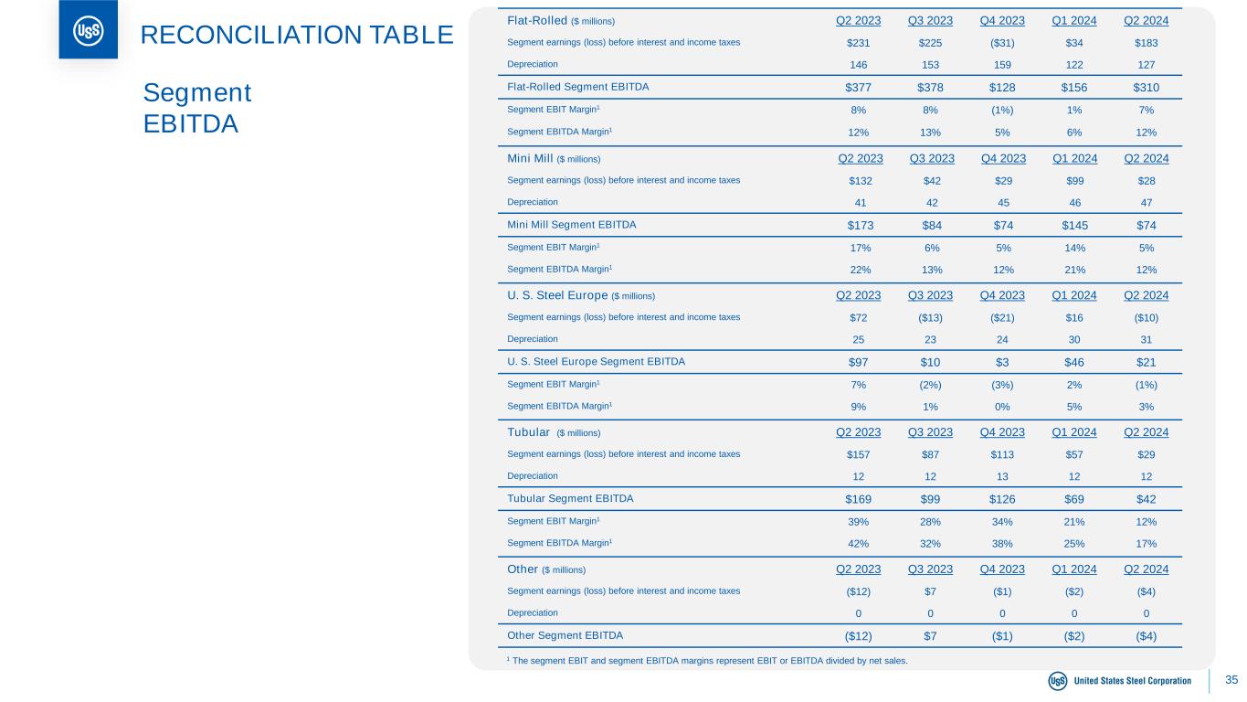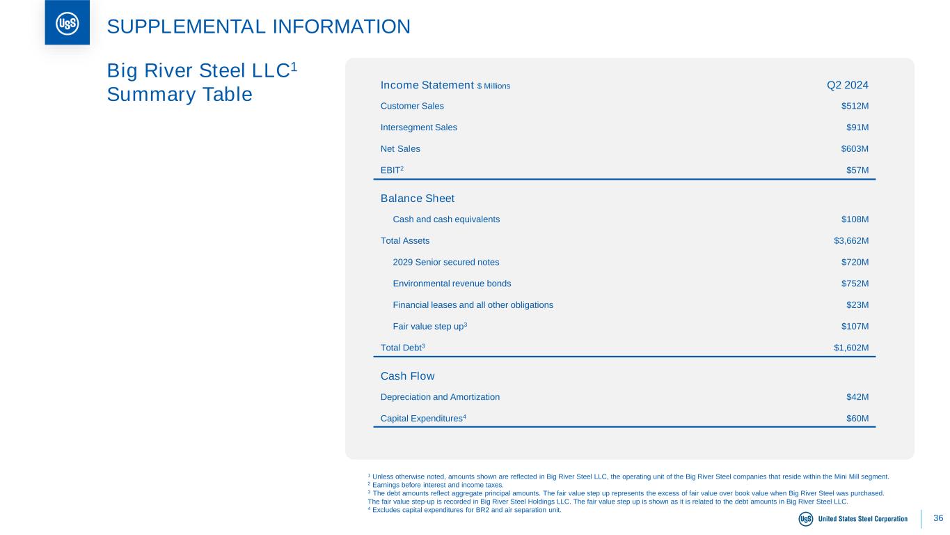 35 RECONCILIATION TABLE Flat-Rolled ($ millions) Q2 2023 Q3 2023 Q4 2023 Q1 2024 Q2 2024 Segment earnings (loss) before interest and income taxes $231 $225 ($31) $34 $183 Depreciation 146 153 159 122 127 Flat-Rolled Segment EBITDA $377 $378 $128 $156 $310 Segment EBIT Margin1 8% 8% (1%) 1% 7% Segment EBITDA Margin1 12% 13% 5% 6% 12% Tubular ($ millions) Q2 2023 Q3 2023 Q4 2023 Q1 2024 Q2 2024 Segment earnings (loss) before interest and income taxes $157 $87 $113 $57 $29 Depreciation 12 12 13 12 12 Tubular Segment EBITDA $169 $99 $126 $69 $42 Segment EBIT Margin1 39% 28% 34% 21% 12% Segment EBITDA Margin1 42% 32% 38% 25% 17% Other ($ millions) Q2 2023 Q3 2023 Q4 2023 Q1 2024 Q2 2024 Segment earnings (loss) before interest and income taxes ($12) $7 ($1) ($2) ($4) Depreciation 0 0 0 0 0 Other Segment EBITDA ($12) $7 ($1) ($2) ($4) Mini Mill ($ millions) Q2 2023 Q3 2023 Q4 2023 Q1 2024 Q2 2024 Segment earnings (loss) before interest and income taxes $132 $42 $29 $99 $28 Depreciation 41 42 45 46 47 Mini Mill Segment EBITDA $173 $84 $74 $145 $74 Segment EBIT Margin1 17% 6% 5% 14% 5% Segment EBITDA Margin1 22% 13% 12% 21% 12% Segment EBITDA U. S. Steel Europe ($ millions) Q2 2023 Q3 2023 Q4 2023 Q1 2024 Q2 2024 Segment earnings (loss) before interest and income taxes $72 ($13) ($21) $16 ($10) Depreciation 25 23 24 30 31 U. S. Steel Europe Segment EBITDA $97 $10 $3 $46 $21 Segment EBIT Margin1 7% (2%) (3%) 2% (1%) Segment EBITDA Margin1 9% 1% 0% 5% 3% 1 The segment EBIT and segment EBITDA margins represent EBIT or EBITDA divided by net sales.
