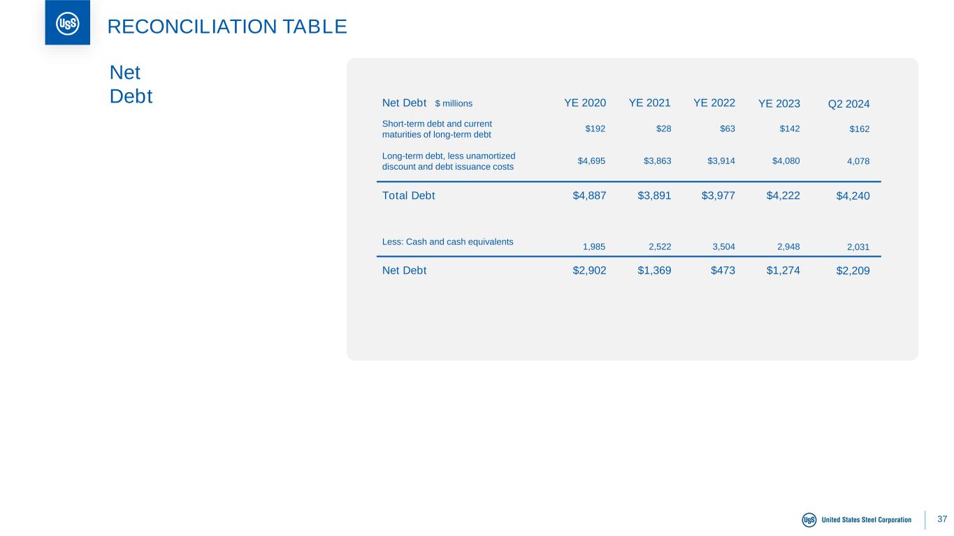 36 SUPPLEMENTAL INFORMATION Big River Steel LLC1 Summary Table Customer Sales Intersegment Sales Net Sales EBIT2 $512M $91M $603M $57M Income Statement $ Millions Q2 2024 Cash and cash equivalents Total Assets 2029 Senior secured notes Environmental revenue bonds Financial leases and all other obligations Fair value step up3 Total Debt3 $108M $3,662M $720M $752M $23M $107M $1,602M Balance Sheet Depreciation and Amortization Capital Expenditures4 $42M $60M Cash Flow 1 Unless otherwise noted, amounts shown are reflected in Big River Steel LLC, the operating unit of the Big River Steel companies that reside within the Mini Mill segment. 2 Earnings before interest and income taxes. 3 The debt amounts reflect aggregate principal amounts. The fair value step up represents the excess of fair value over book value when Big River Steel was purchased. The fair value step-up is recorded in Big River Steel Holdings LLC. The fair value step up is shown as it is related to the debt amounts in Big River Steel LLC. 4 Excludes capital expenditures for BR2 and air separation unit.