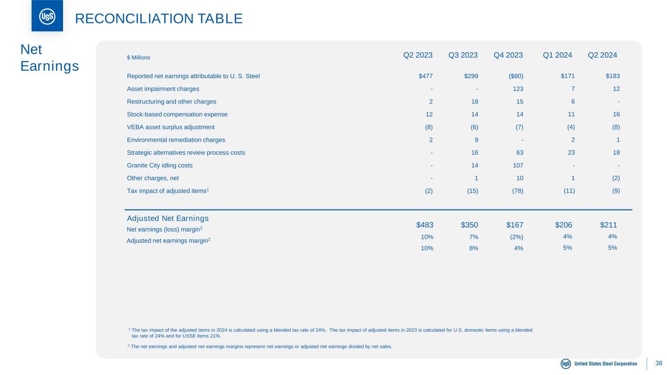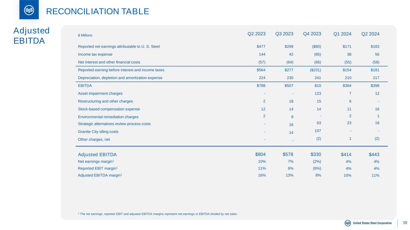 38 RECONCILIATION TABLE Adjusted Net Earnings 1 The tax impact of the adjusted items in 2024 is calculated using a blended tax rate of 24%. The tax impact of adjusted items in 2023 is calculated for U.S. domestic items using a blended tax rate of 24% and for USSE items 21%. $167$350$483 Reported net earnings attributable to U. S. Steel Asset impairment charges Restructuring and other charges Stock-based compensation expense VEBA asset surplus adjustment Environmental remediation charges Strategic alternatives review process costs Granite City idling costs Other charges, net Tax impact of adjusted items1 $477 - 2 12 (8) 2 - - - (2) $299 - 18 14 (6) 9 16 14 1 (15) ($80) 123 15 14 (7) - 63 107 10 (78) Net Earnings Net earnings (loss) margin2 Adjusted net earnings margin2 10% 10% 7% 8% (2%) 4% 2 The net earnings and adjusted net earnings margins represent net earnings or adjusted net earnings divided by net sales. Q1 2024 $206 4% 5% Q4 2023Q3 2023Q2 2023$ Millions $171 7 6 11 (4) 2 23 - 1 (11) Q2 2024 $211 4% 5% $183 12 - 16 (8) 1 18 - (2) (9)
