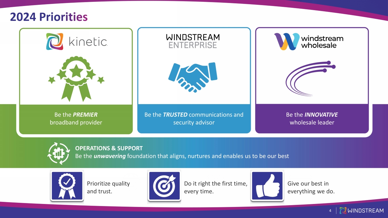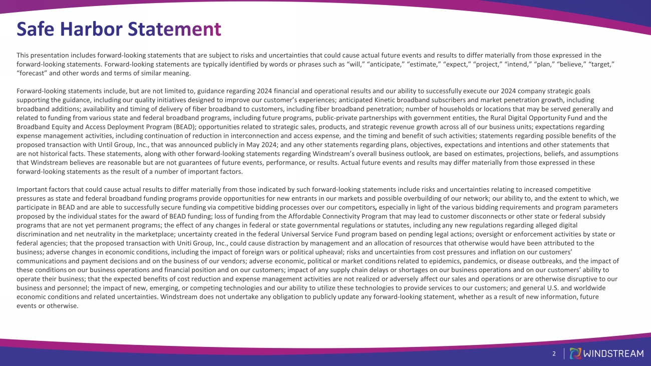 2 This presentation includes forward - looking statements that are subject to risks and uncertainties that could cause actual future events and results to differ materially from those expressed in the forward - looking statements. Forward - looking statements are typically identified by words or phrases such as “will,” “anticipate, ” “estimate,” “expect,” “project,” “intend,” “plan,” “believe,” “target,” “forecast” and other words and terms of similar meaning. Forward - looking statements include, but are not limited to, guidance regarding 2024 financial and operational results and our ab ility to successfully execute our 2024 company strategic goals supporting the guidance, including our quality initiatives designed to improve our customer’s experiences; anticipated Kineti c b roadband subscribers and market penetration growth, including broadband additions; availability and timing of delivery of fiber broadband to customers, including fiber broadband penetrati on; number of households or locations that may be served generally and related to funding from various state and federal broadband programs, including future programs, public - private partnerships wit h government entities, the Rural Digital Opportunity Fund and the Broadband Equity and Access Deployment Program (BEAD); opportunities related to strategic sales, products, and strategic reve nue growth across all of our business units; expectations regarding expense management activities, including continuation of reduction in interconnection and access expense, and the timing and ben efit of such activities; statements regarding possible benefits of the proposed transaction with Until Group, Inc., that was announced publicly in May 2024; and any other statements regarding plan s, objectives, expectations and intentions and other statements that are not historical facts. These statements, along with other forward - looking statements regarding Windstream’s overall business outlook, are based on estimates, projections, beliefs, and assumptions that Windstream believes are reasonable but are not guarantees of future events, performance, or results. Actual future event s a nd results may differ materially from those expressed in these forward - looking statements as the result of a number of important factors. Important factors that could cause actual results to differ materially from those indicated by such forward - looking statements i nclude risks and uncertainties relating to increased competitive pressures as state and federal broadband funding programs provide opportunities for new entrants in our markets and possible overbuilding of our network; our ability to, and the extent to which, we participate in BEAD and are able to successfully secure funding via competitive bidding processes over our competitors , especially in light of the various bidding requirements and program parameters proposed by the individual states for the award of BEAD funding; loss of funding from the Affordable Connectivity Program tha t m ay lead to customer disconnects or other state or federal subsidy programs that are not yet permanent programs; the effect of any changes in federal or state governmental regulations or statu tes , including any new regulations regarding alleged digital discrimination and net neutrality in the marketplace; uncertainty created in the federal Universal Service Fund program based on pending legal actions; oversight or enforcement ac tiv ities by state or federal agencies; that the proposed transaction with Uniti Group, Inc., could cause distraction by management and an allocation of resources that otherwise would have been attributed t o the business; adverse changes in economic conditions, including the impact of foreign wars or political upheaval; risks and uncer tai nties from cost pressures and inflation on our customers’ communications and payment decisions and on the business of our vendors; adverse economic, political or market conditions related to epidemics, pandemics, or dise ase outbreaks, and the impact of these conditions on our business operations and financial position and on our customers; impact of any supply chain delays or sh ortages on our business operations and on our customers’ ability to operate their business; that the expected benefits of cost reduction and expense management activities are not realized or ad ver sely affect our sales and operations or are otherwise disruptive to our business and personnel; the impact of new, emerging, or competing technologies and our ability to utilize these technologies to provide services to our customers; and general U.S. and worldwide economic conditions and related uncertainties. Windstream does not undertake any obligation to publicly update any forward - looki ng statement, whether as a result of new information, future events or otherwise.