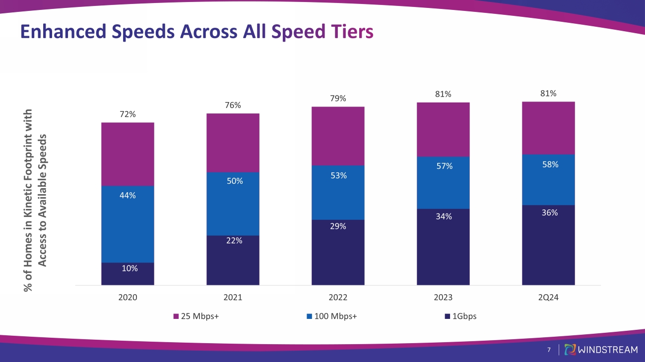 1,258 1,290 1,352 1,396 1,437 1,466 26 34 40 48 54 64 10 12 14 15 17 23 1,000 1,100 1,200 1,300 1,400 1,500 1,600 1Q23 2Q23 3Q23 4Q23 1Q24 2Q24 1 Gbps Consumer Premises Passed by Type (in 000’s) RDOF PPP Strategic 94K 1 Gbps Consumer Premises Constructed Year to Date 6 1,553 1,294 1,336 1,406 1,459 1,508
