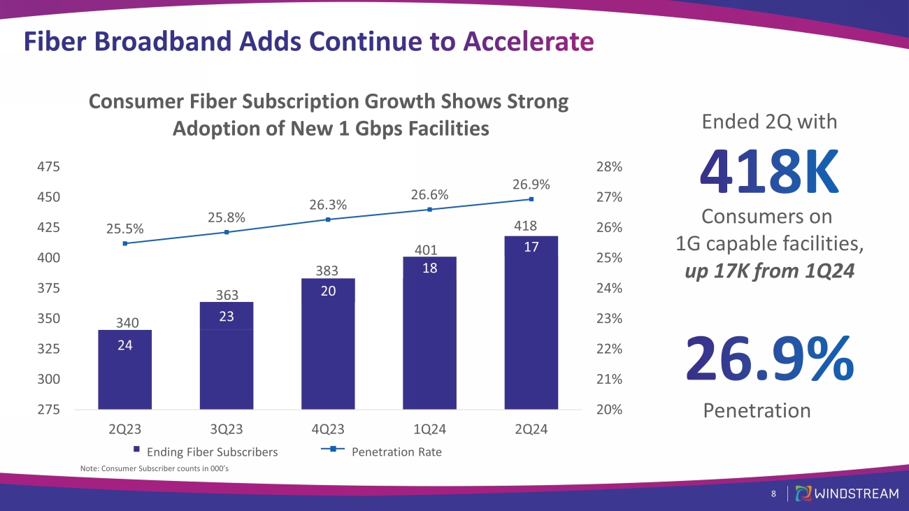 | 2Q24 Earnings Call Script 5 In addition, our internal construction team continues to make productivity gains and sharpens their execution skills through terrains in rural areas that we anticipate will be very similar to BEAD builds. The experience and expertise gained, along with our quality-focused approach, gives us assurance that we can reliably meet our build commitments under these programs as well as those under BEAD. And so, we look forward to the opportunity to continue our pursuit of connecting the unserved and underserved with our fiber. Now let’s look at our fiber broadband subscribers, as seen on Slide 8. We ended the quarter with 418,000 subscribers on our fiber network, representing a 26.9% penetration rate, an improvement of 30 basis points sequentially. Additionally, you can see the performance from our Fiber Fast Start initiative on Slide 9, as our latest cohorts are showing impressive penetration results. Furthermore, we launched our Fiber Forward initiative during the second quarter, which leverages the tactics and learning from Fiber Fast Start to reinvigorate our older cohorts. With the benefit to customer additions from these two programs, as well as the churn improvements from our quality initiatives, we see opportunities ahead to further propel our fiber penetration. Strategic revenues within our Enterprise and Wholesale markets had a solid performance. Within Enterprise, we continue our focus on Strategic and Advanced IP portfolios, which now represent 89% of our total Enterprise Market service revenues on an annualized basis, excluding end-user surcharges. |