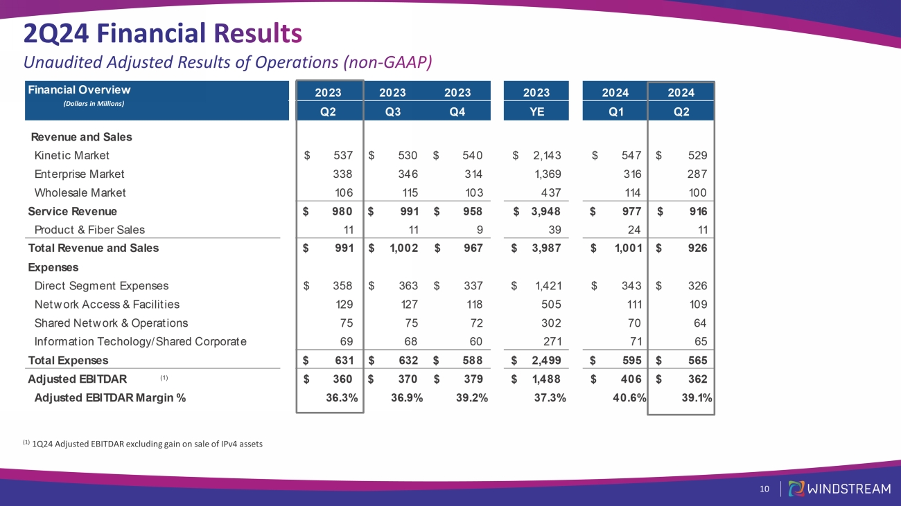 | 2Q24 Earnings Call Script 9 Turning to expenses: • Total cash expenses during the second quarter fell by $67 million, or approximately 11%, year-over-year, as our quality and unification efforts across the company continue to deliver solid results. On slide 11, I wanted to provide our regular update on our interconnection expense reduction activities. Our total interconnection and network facility expenses fell by 16% on a year-over-year basis during the second quarter. We reduced these total expenses on a recurring annualized basis by over $125 million year-over-year. Notably, we still have $645 million of total interconnection expenses, of which $279 million are legacy TDM-related including network facilities expense. These expenses fell by 26% year-over-year. In particular, the Enterprise access and service delivery teams have fully exited over 350 collocations associated with our TDM migration plans year-to-date. Transitioning to slide 12, Windstream has a strong balance sheet with no current debt maturities until 2027. As of June 30th, we ended with $462 million in total liquidity and a net debt to adjusted EBITDA ratio of 2.19x. As seen on slide 13, Windstream fully owns and operates substantial assets. Within our Kinetic markets, approximately 31% of our current fiber broadband consumers are on a network that is entirely owned and operated by Kinetic. |
