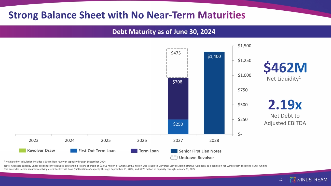 $250 $0 $0 $0 $0 $708 $1,400 $- $250 $500 $750 $1,000 $1,250 $1,500 2023 2024 2025 2026 2027 2028 $475 Debt Maturity as of November 10, 2022 Revolver Draw Note : Available capacity under credit facility excludes outstanding letters of credit of $134.1 million of which $104.6 million w as issued to Universal Service Administrative Company as a condition for Windstream receiving RDOF funding The amended senior secured revolving credit facility will have $500 million of capacity through September 21, 2024, and $475 mil lion of capacity through January 23, 2027 Net Liquidity 1 Net Debt to Adjusted EBITDA First Out Term Loan 1 Net Liquidity calculation includes $500 million revolver capacity through September 2024 Debt Maturity as of June 30, 2024 12 Term Loan Senior First Lien Notes Undrawn Revolver
