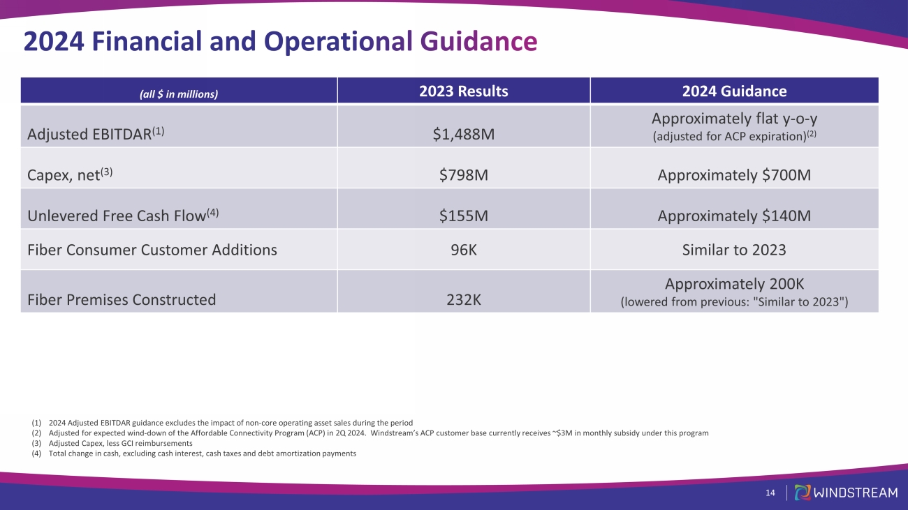 Broadband Consumers (1) Fiber Broadband Consumers (1) Fiber Route Miles (1)(4) Fiber Households Today (1) Fiber Households – Build Plan (1) Windstream Owns 100GB POPs (1) Total Consumer Revenues (2) Kinetic Owned Assets (3) E&W Owned Assets (3) Kinetic Fully Owned and Operated Metrics 215K (20.7%) 117K (31.3%) 453K (29.2%) 651K (35.0%) $229M $2.5B E&W Owned & Operated 80K (75.0%) 1,358 (100.0%) $ 1.0B (1) Metric represents number and percentage of Windstream total not associated or encumbered by Uniti Master Lease Agreements as of June 30, 2024 (2) Consumer Revenues for FY 2023 that are not within in - footprint ILEC markets governed by Uniti ILEC Master Lease Agreement (3) Kinetic and E&W Owned Assets represent net PP&E, excluding CWIP, as of December 31, 2023, for Windstream owned assets (4) Beginning in 2Q24, the calculation of Fiber Route Miles was modified to align with Uniti disclosures 13