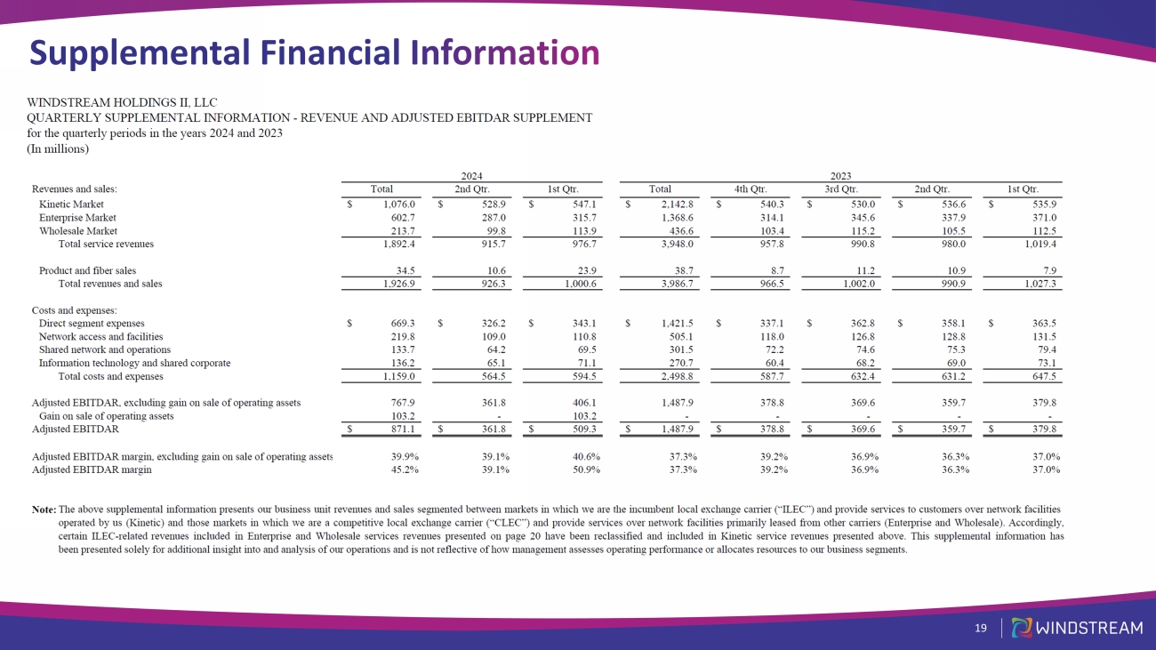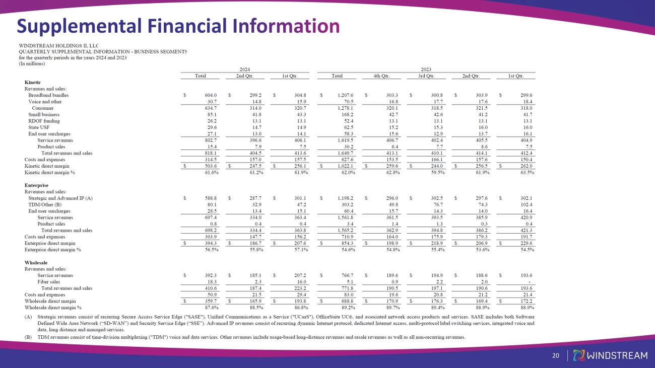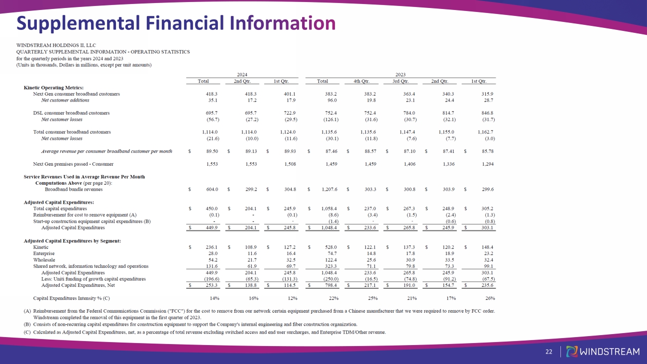 | 2Q24 Earnings Presentation Script July 31, 2024 Genesis White Good morning everyone and thank you for joining Windstream’s second quarter 2024 earnings conference call. Joining me on the call today are: • Paul Sunu, our CEO, and • Drew Smith, our CFO and Treasurer To accompany today’s call, we have posted the presentation slides and supplemental schedule on our various investor websites. If you do not have access to these websites, please reach out to me at Genesis dot White at windstream dot com. Our financial statements, prepared in accordance with U.S. GAAP, will be available by mid-August to our lenders and investors, in compliance with the terms of the Credit Agreement, Indenture, and Amended and Restated LLC Agreement. During the second quarter of 2024, we adjusted certain expense assignments between Kinetic, Enterprise and shared services. Prior period segment information, as previously reported in the first quarter 2024 investor supplement, has been revised to reflect these updates. |