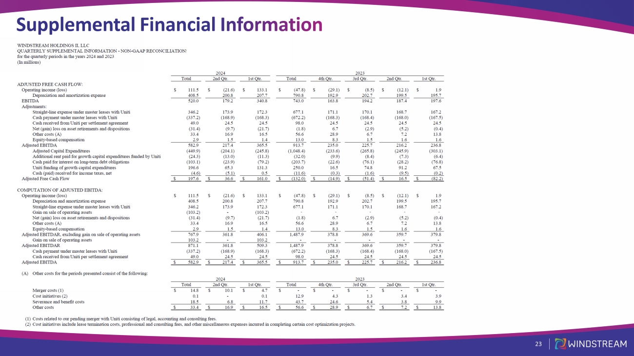 The Company is updating its 2024 outlook primarily for business unit level revisions, recent financing transactions, and transaction related and other costs incurred to date. Our outlook excludes any impact from the expected merger with Windstream, future acquisitions, capital market transactions, and future transaction-related and other costs not mentioned herein.