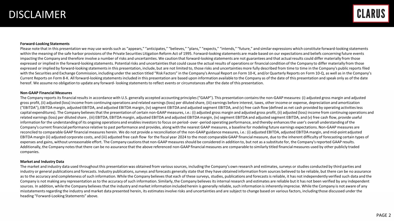 6 February 2023 PAGE 2 Forward - Looking Statements Please note that in this presentation we may use words such as “appears,” “anticipates,” “believes,” “plans,” “expects,” “int end s,” “future,” and similar expressions which constitute forward - looking statements within the meaning of the safe harbor provisions of the Private Securities Litigation Reform Act of 1995. Forward - looking statem ents are made based on our expectations and beliefs concerning future events impacting the Company and therefore involve a number of risks and uncertainties. We caution that forward - looking statements are not guarantees and that actual results could differ materially from those expressed or implied in the forward - looking statements. Potential risks and uncertainties that could cause the actual results of operations or financial condition of the Company to differ materially from those expressed or implied by forward - looking statements in this presentation, include, but are not limited to, those risks and uncert ainties more fully described from time to time in the Company's public reports filed with the Securities and Exchange Commission, including under the section titled “Risk Factors” in the Company's Annual Report on Form 10 - K, and/or Quarterly Reports on Form 10 - Q, as well as in the Company’s Current Reports on Form 8 - K. All forward - looking statements included in this presentation are based upon information available t o the Company as of the date of this presentation and speak only as of the date hereof. We assume no obligation to update any forward - looking statements to reflect events or circumstances after the date of t his presentation. Non - GAAP Financial Measures The Company reports its financial results in accordance with U.S. generally accepted accounting principles (“GAAP”). This pre sen tation contains the non - GAAP measures: ( i ) adjusted gross margin and adjusted gross profit, (ii) adjusted (loss) income from continuing operations and related earnings (loss) per diluted share, (iii) ear nin gs before interest, taxes, other income or expense, depreciation and amortization (“EBITDA”), EBITDA margin, adjusted EBITDA, and adjusted EBITDA margin , (iv) segment EBITDA and adjusted segment EBITDA, and (v) free cash flow (defined as net cash provided by operating activities less capital expenditures). The Company believes that the presentation of certain non - GAAP measures, i.e.: ( i ) adjusted gross margin and adjusted gross profit, (ii) adjusted (loss) income from continuing operations and related earnings (loss) per diluted share , (iii) EBITDA, EBITDA margin, adjusted EBITDA and adjusted EBITDA margin, (iv) segment EBITDA and adjusted segment EBITDA, an d (v) free cash flow, provide useful information for the understanding of its ongoing operations and enables investors to focus on period - over - period operating per formance, and thereby enhances the user's overall understanding of the Company's current financial performance relative to past performance and provides, along with the nearest GAAP measures, a ba sel ine for modeling future earnings expectations. Non - GAAP measures are reconciled to comparable GAAP financial measures herein. We do not provide a reconciliation of the non - GAAP guidance measures, i.e.: ( i ) a djusted EBITDA, adjusted EBITDA m argin, and mid - point adjusted EBITDA margin (ii) adjusted corporate costs, and (iii) adjusted free cash flow for the fiscal year 2024 to the most comparab le GAAP financial measure, due to the inherent difficulty of forecasting certain types of expenses and gains, without unreasonable effort. The Company cautions that non - GAAP measures should be considered in addition to, but not as a substitute for, the Company's repo rted GAAP results. Additionally, the Company notes that there can be no assurance that the above referenced non - GAAP financial measures are compara ble to similarly titled financial measures used by other publicly traded companies. Market and Industry Data The market and industry data used throughout this presentation was obtained from various sources, including the Company’s own re search and estimates, surveys or studies conducted by third parties and industry or general publications and forecasts. Industry publications, surveys and forecasts generally state that they have o bta ined information from sources believed to be reliable, but there can be no assurance as to the accuracy and completeness of such information. While the Company believes that each of these surveys, studies, publ ica tions and forecasts is reliable, it has not independently verified such data and the Company is not making any representation as to the accuracy of such information. Similarly, the Company believes its internal re search and estimates are reliable but it has not been verified by any independent sources. In addition, while the Company believes that the industry and market information included herein is generally reliab le, such information is inherently imprecise. While the Company is not aware of any misstatements regarding the industry and market data presented herein, its estimates involve risks and uncertainties and are sub ject to change based on various factors, including those discussed under the heading “Forward - Looking Statements” above. DISCLAIMER