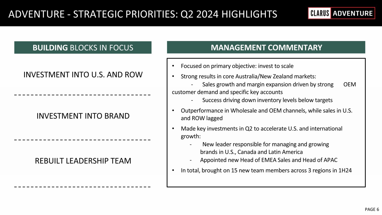 6 February 2023 PAGE 6 ADVENTURE - STRATEGIC PRIORITIES: Q2 2024 HIGHLIGHTS • Focused on primary objective: invest to scale • Strong results in core Australia/New Zealand markets: - Sales growth and margin expansion driven by strong OEM customer demand and specific key accounts - Success driving down inventory levels below targets • Outperformance in Wholesale and OEM channels, while sales in U.S. and ROW lagged • Made key investments in Q2 to accelerate U.S. and international growth: - New leader responsible for managing and growing brands in U.S., Canada and Latin America - Appointed new Head of EMEA Sales and Head of APAC • In total, brought on 15 new team members across 3 regions in 1H24 MANAGEMENT COMMENTARY BUILDING BLOCKS IN FOCUS INVESTMENT INTO U.S. AND ROW INVESTMENT INTO BRAND REBUILT LEADERSHIP TEAM