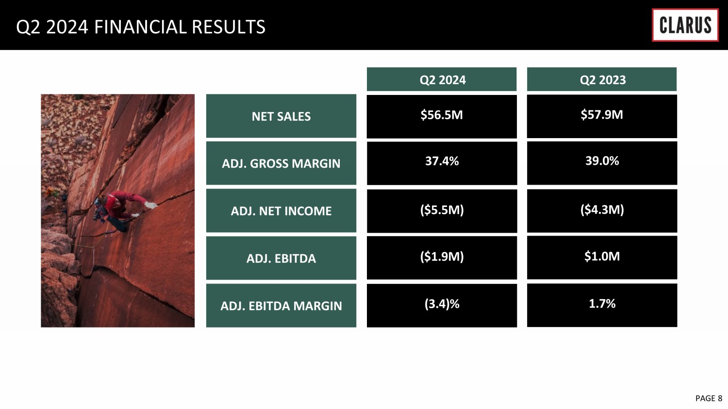 6 February 2023 PAGE 7 OUTDOOR - STRATEGIC PRIORITIES: Q2 2024 HIGHLIGHTS • Strategic initiatives continuing to yield incremental near - term benefits, driving Q2 results in line with expectations • Market still adjusting to post - pandemic demand levels • Benefitting from rebuilt sales team in North America – in 1H 2024, NA Wholesale grew 1% y/y; stabilization trend intact • Challenging demand trends in Europe but signs that conditions should stabilize in 2H 2024 • Consistent with simplification objectives, operating costs down 9% year over year with continued improvement expected during remainder of 2024 • Further progress on inventory reduction initiatives, highlighted by 17% inventory decline in Q2 y/y • Undertaking strategic review of PIEPS snow safety brand MANAGEMENT COMMENTARY BUILDING BLOCKS IN FOCUS SIMPLIFICATION EXECUTION PRODUCT LEADERSHIP FEWER, BIGGER, BETTER