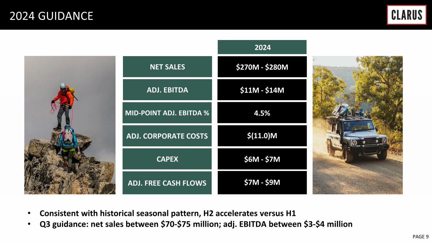 The Company continues to expect fiscal year 2024 sales to range between $270 million to $280 million. Due to investments seeking to scale the Adventure segment, particularly in North America, Europe and through direct marketing initiatives, the Company now expects adjusted EBITDA of approximately $11 million to $14 million, or an adjusted EBITDA margin of 4.5% at the mid-point of revenue and adjusted EBITDA. In addition, the Company now expects capital expenditures to range between $6 million to $7 million, of which $0.9 million related to Precision Sport prior to disposal, and adjusted free cash flow to range between $7 million to $9 million for the full year 2024, excluding $2.0 million of cash outflow related to Precision Sport prior to disposal.