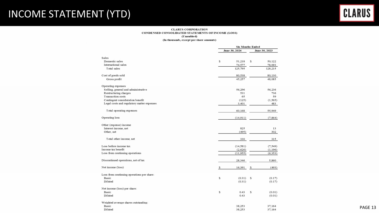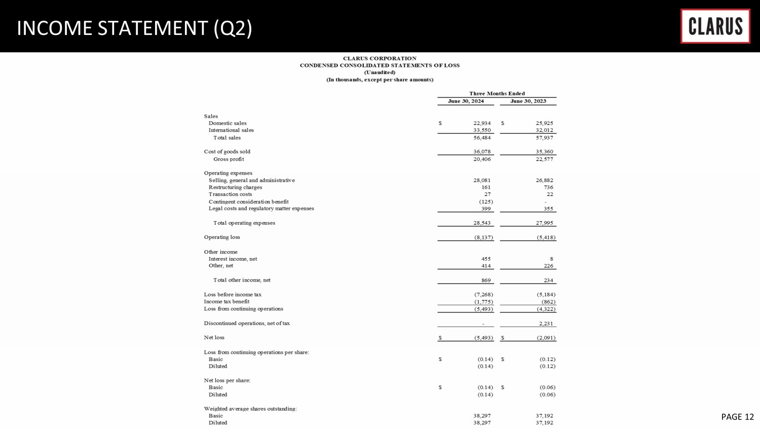 SALT LAKE CITY, August 1, 2024 (GLOBE NEWSWIRE) -- Clarus Corporation (NASDAQ: CLAR) (“Clarus” and/or the “Company”), a global company focused on the outdoor enthusiast markets, reported financial results for the second quarter ended June 30, 2024.