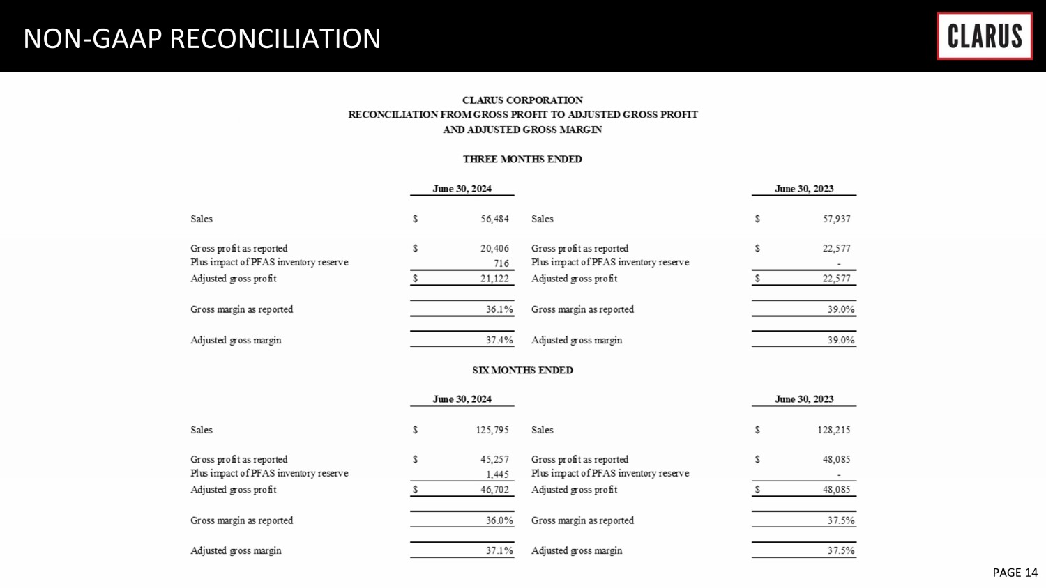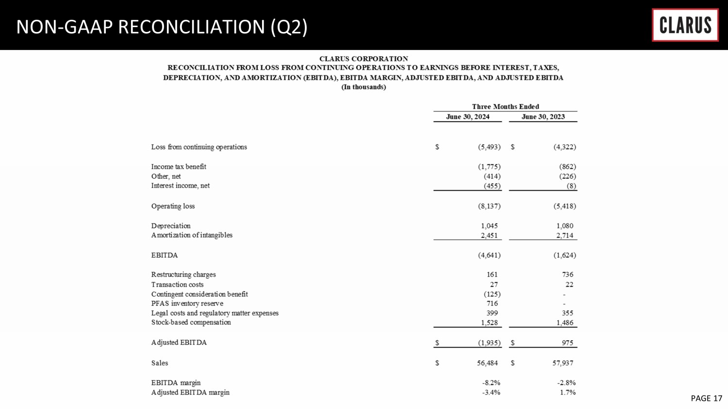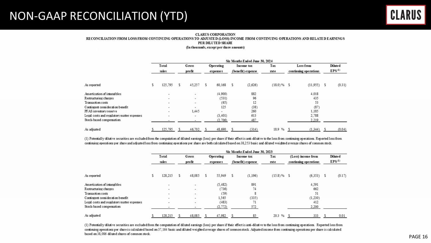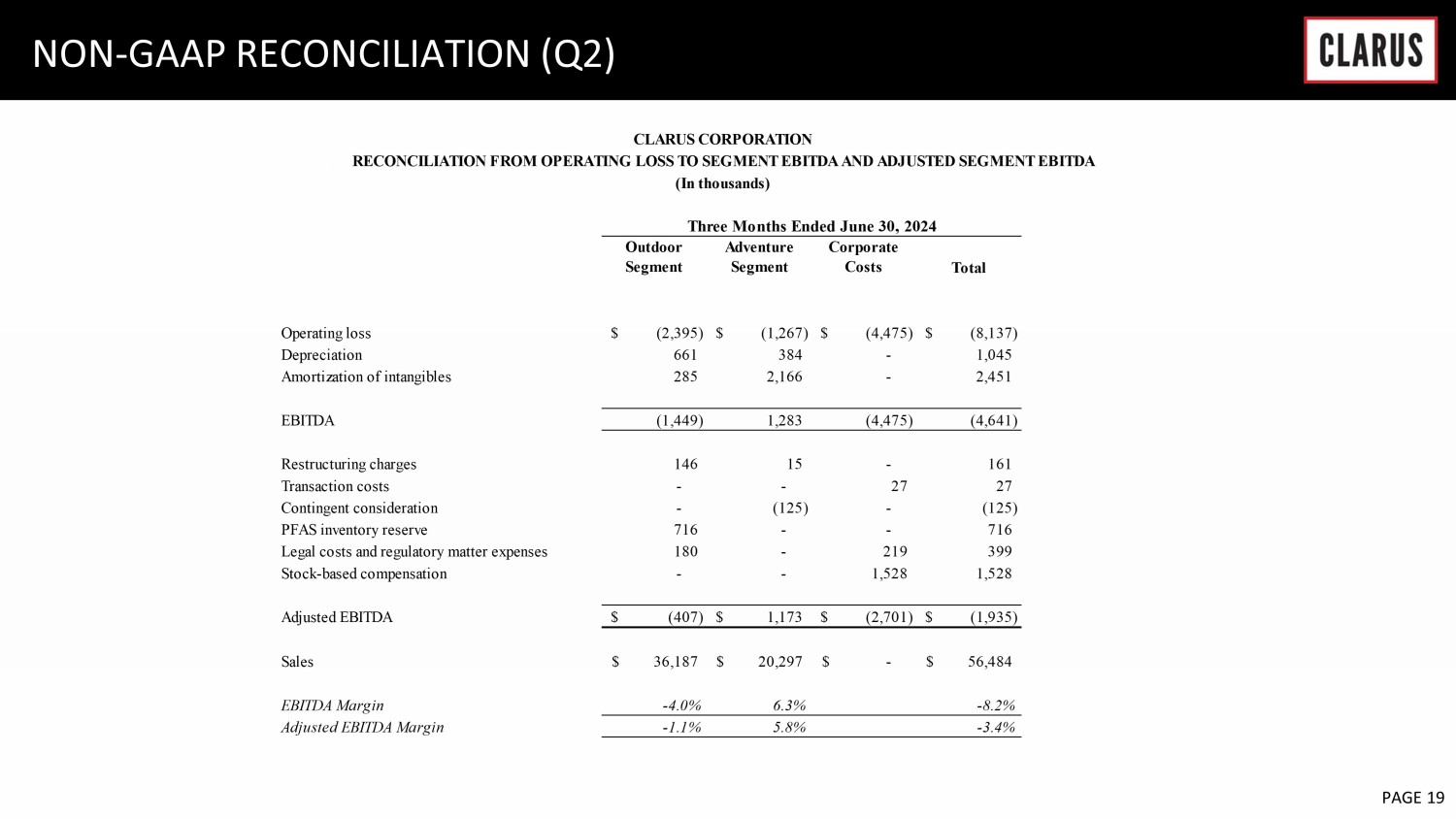 6 February 2023 PAGE 19 NON - GAAP RECONCILIATION (Q2) Outdoor Segment Adventure Segment Corporate Costs Total Operating loss (2,395)$ (1,267)$ (4,475)$ (8,137)$ Depreciation 661 384 - 1,045 Amortization of intangibles 285 2,166 - 2,451 EBITDA (1,449) 1,283 (4,475) (4,641) Restructuring charges 146 15 - 161 Transaction costs - - 27 27 Contingent consideration - (125) - (125) PFAS inventory reserve 716 - - 716 Legal costs and regulatory matter expenses 180 - 219 399 Stock-based compensation - - 1,528 1,528 Adjusted EBITDA (407)$ 1,173$ (2,701)$ (1,935)$ Sales 36,187$ 20,297$ -$ 56,484$ EBITDA Margin -4.0% 6.3% -8.2% Adjusted EBITDA Margin -1.1% 5.8% -3.4% CLARUS CORPORATION (In thousands) RECONCILIATION FROM OPERATING LOSS TO SEGMENT EBITDA AND ADJUSTED SEGMENT EBITDA Three Months Ended June 30, 2024