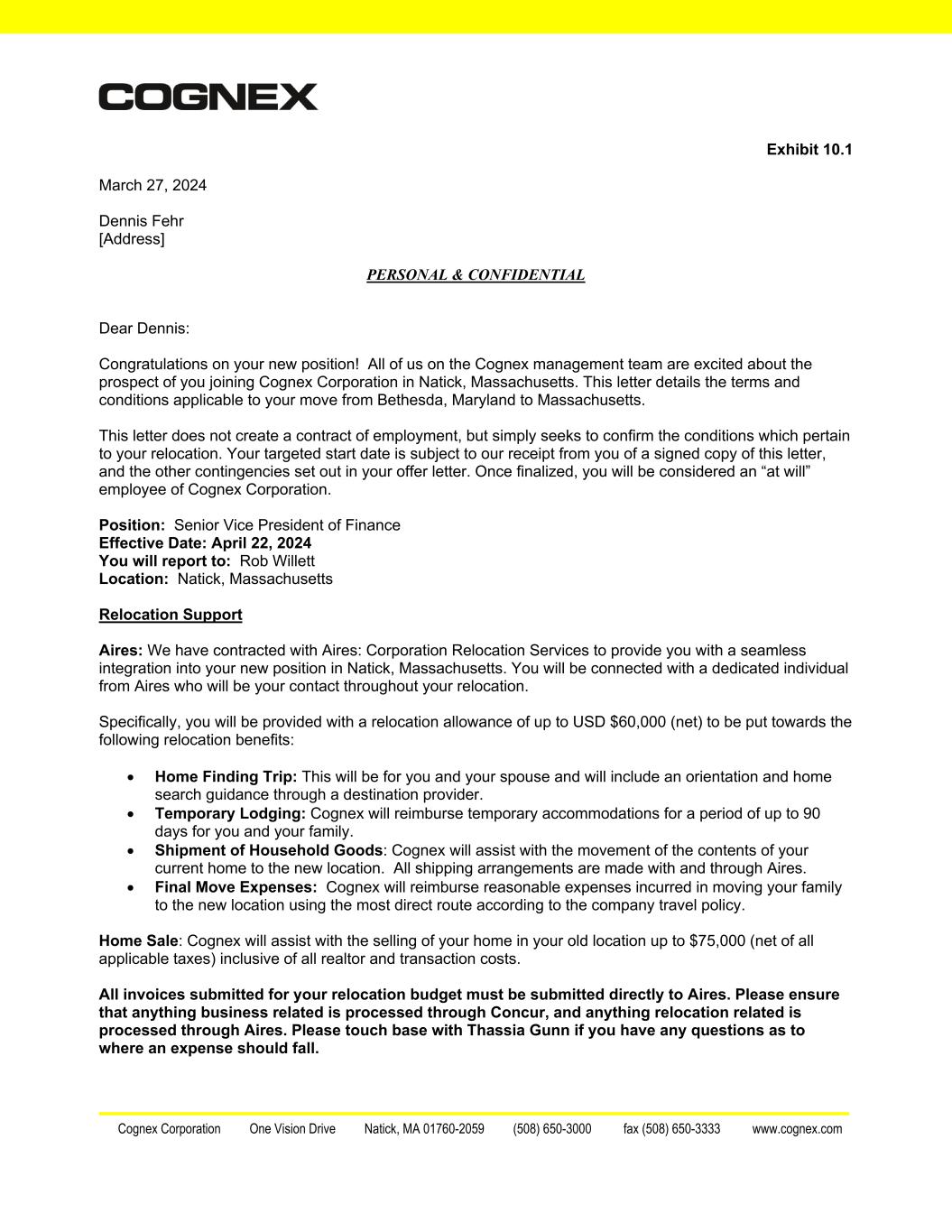 Cognex Corporation One Vision Drive Natick, MA 01760-2059 (508) 650-3000 fax (508) 650-3333 www.cognex.com Exhibit 10.1 March 27, 2024 Dennis Fehr [Address] PERSONAL & CONFIDENTIAL Dear Dennis: Congratulations on your new position! All of us on the Cognex management team are excited about the prospect of you joining Cognex Corporation in Natick, Massachusetts. This letter details the terms and conditions applicable to your move from Bethesda, Maryland to Massachusetts. This letter does not create a contract of employment, but simply seeks to confirm the conditions which pertain to your relocation. Your targeted start date is subject to our receipt from you of a signed copy of this letter, and the other contingencies set out in your offer letter. Once finalized, you will be considered an “at will” employee of Cognex Corporation. Position: Senior Vice President of Finance Effective Date: April 22, 2024 You will report to: Rob Willett Location: Natick, Massachusetts Relocation Support Aires: We have contracted with Aires: Corporation Relocation Services to provide you with a seamless integration into your new position in Natick, Massachusetts. You will be connected with a dedicated individual from Aires who will be your contact throughout your relocation. Specifically, you will be provided with a relocation allowance of up to USD $60,000 (net) to be put towards the following relocation benefits: • Home Finding Trip: This will be for you and your spouse and will include an orientation and home search guidance through a destination provider. • Temporary Lodging: Cognex will reimburse temporary accommodations for a period of up to 90 days for you and your family. • Shipment of Household Goods: Cognex will assist with the movement of the contents of your current home to the new location. All shipping arrangements are made with and through Aires. • Final Move Expenses: Cognex will reimburse reasonable expenses incurred in moving your family to the new location using the most direct route according to the company travel policy. Home Sale: Cognex will assist with the selling of your home in your old location up to $75,000 (net of all applicable taxes) inclusive of all realtor and transaction costs. All invoices submitted for your relocation budget must be submitted directly to Aires. Please ensure that anything business related is processed through Concur, and anything relocation related is processed through Aires. Please touch base with Thassia Gunn if you have any questions as to where an expense should fall.